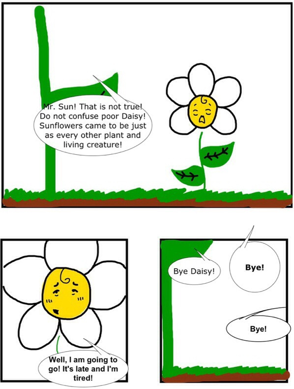 A comic about the odd adventures of Daisy and her friend the Sun. Daisy has this weird curly thing flowers probably shouldn't have.... The Sun has one eye and this odd and conspicuous triangle on his forehead. Later on Daisy will meet other flowers, plants and whatever the crazy author thinks of!