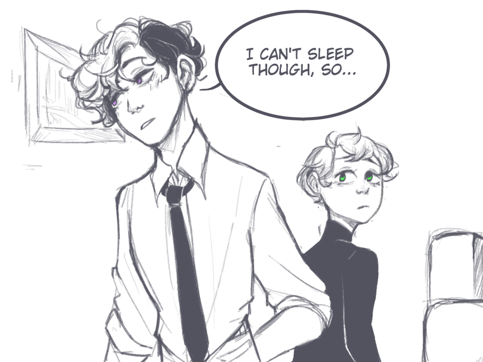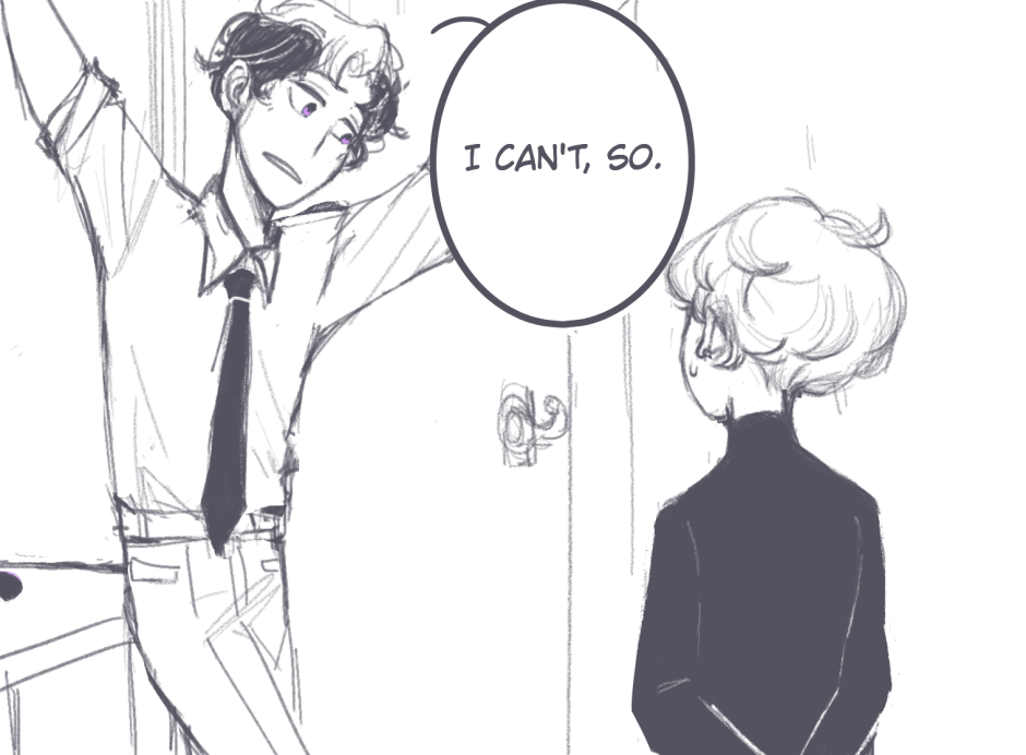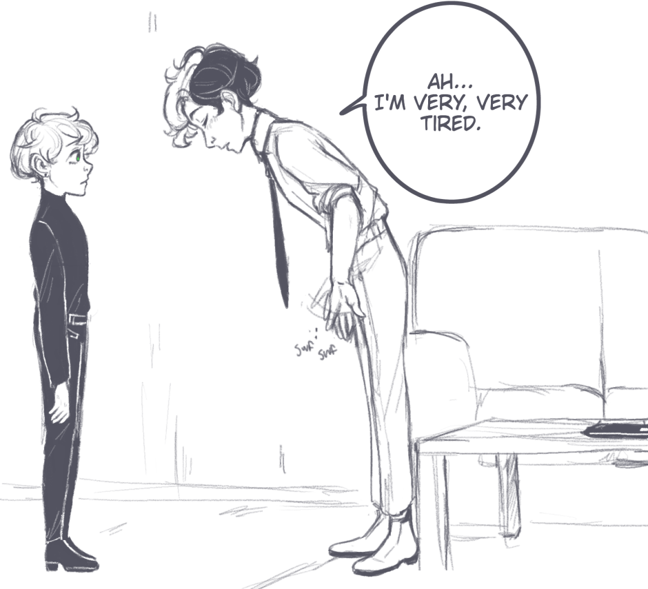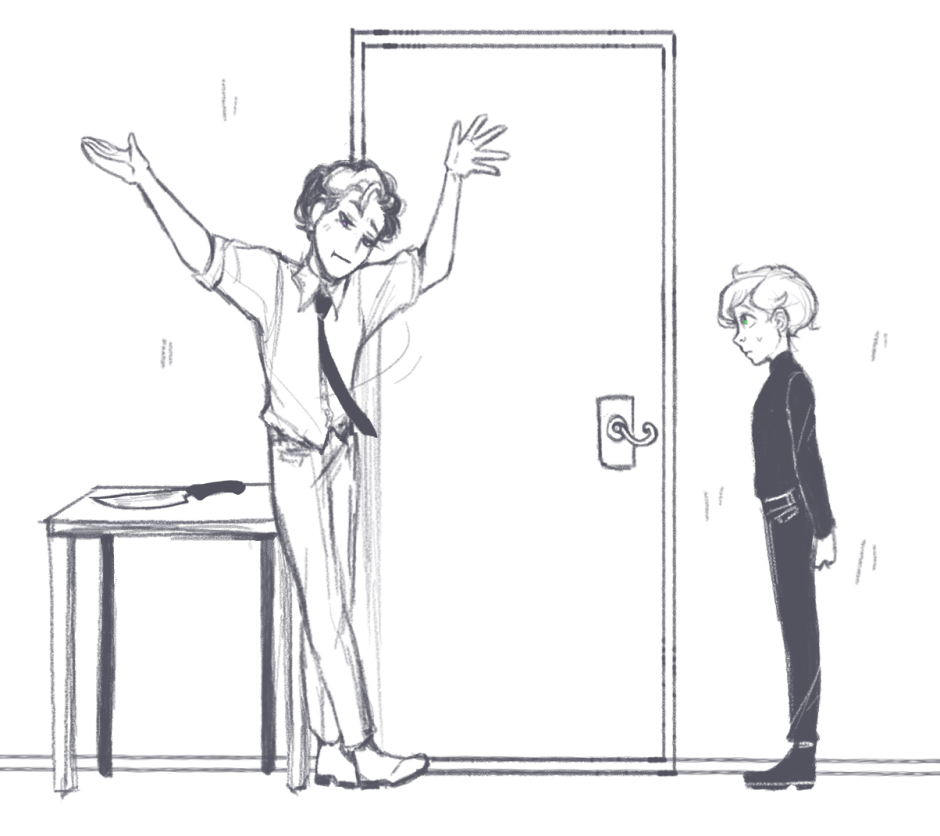 Is he stalling? Something in the bedroom? Does he want Rochette to go in with him?