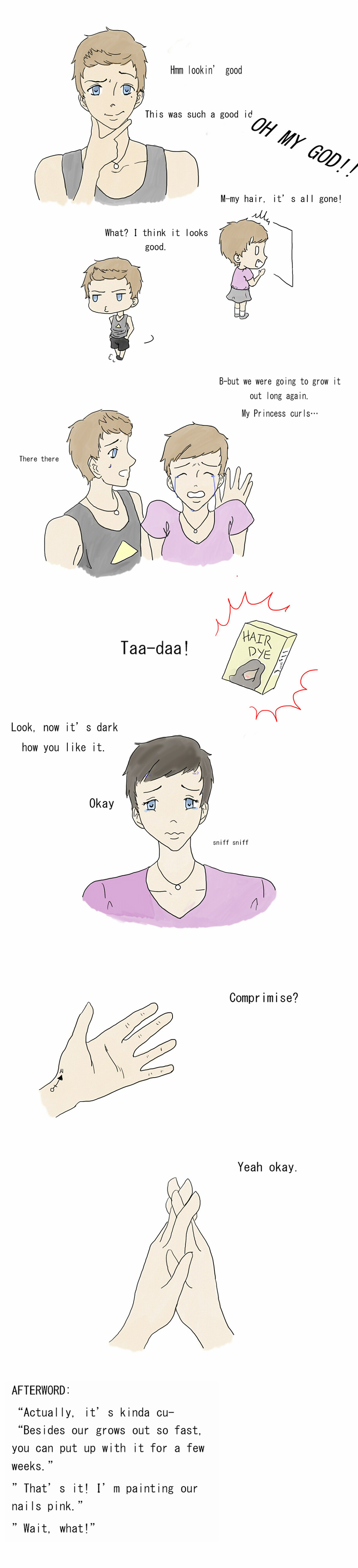 It's a tough go sometimes, but compromise is key...and good wigs haha My hand will be in a splint for a few weeks more so I was very lazy with the coloring; it hurts to hold a pen for long periods of time.