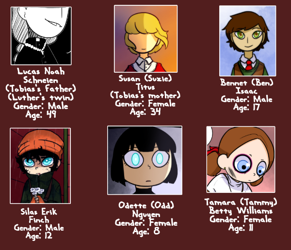 Brief list of characters. I'll do a recap at the end of Halloween night before Part 4. I left out a few but they're mainly from Tobias's family such as his siblings, grandmother, aunts, uncles, and cousins. They'll be more prominent in Season 2 for the story's Christmas season but for now they're not really worth mentioning.