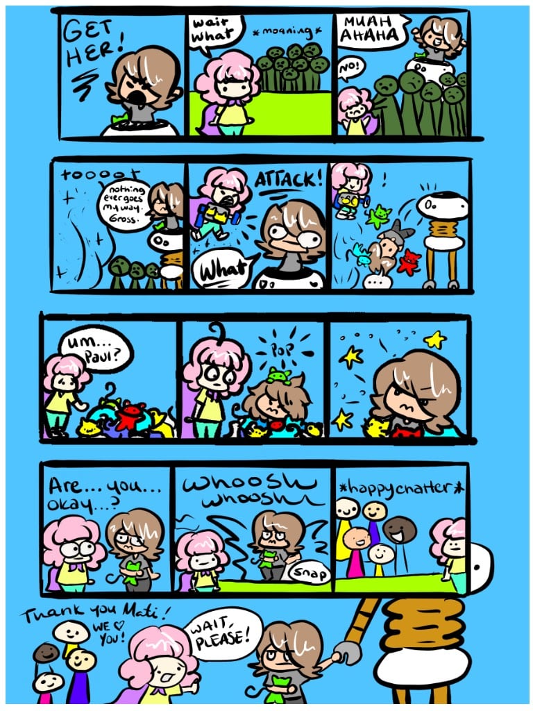 Paul makes the townspeople into sad zombies, and Mati tries to save the day.