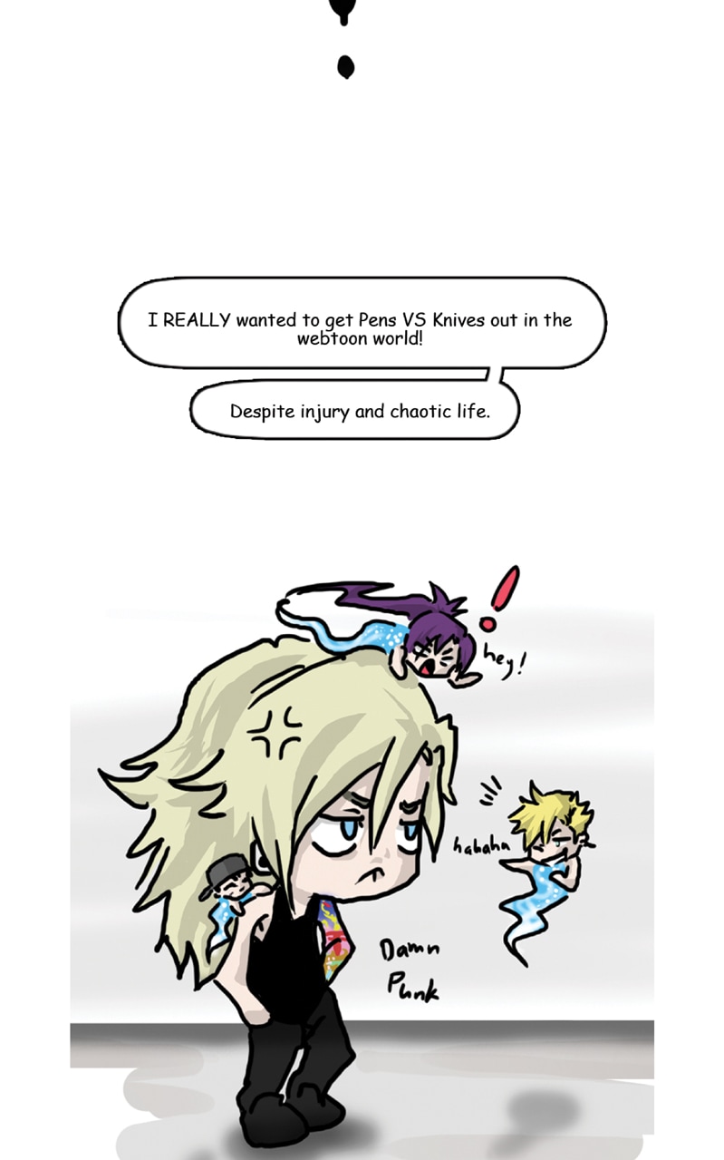 NEW Pens VS Knives go here!: https://tapas.io/series/Pens-VS-Knives I wanted to explain hiatus details and break some great news! Pens VS Knives, has been re-written and re-drawn from scratch! Please be ready to welcome my new co-artist, the wonderfully talented, Yokoshiro-Yin! To avoid any confusion, the new series will be re-released and this will be archived (but still available via my profile.) Chapter 1 will be out in the next 24hrs! Thank you for your support and patience!