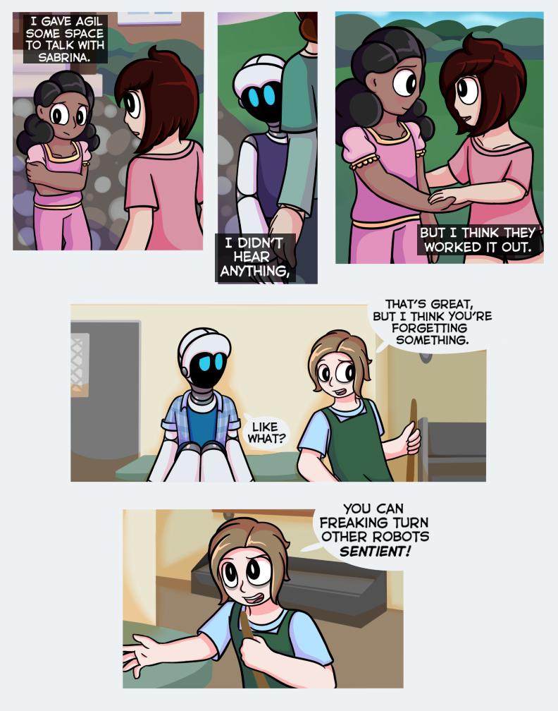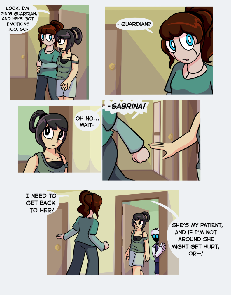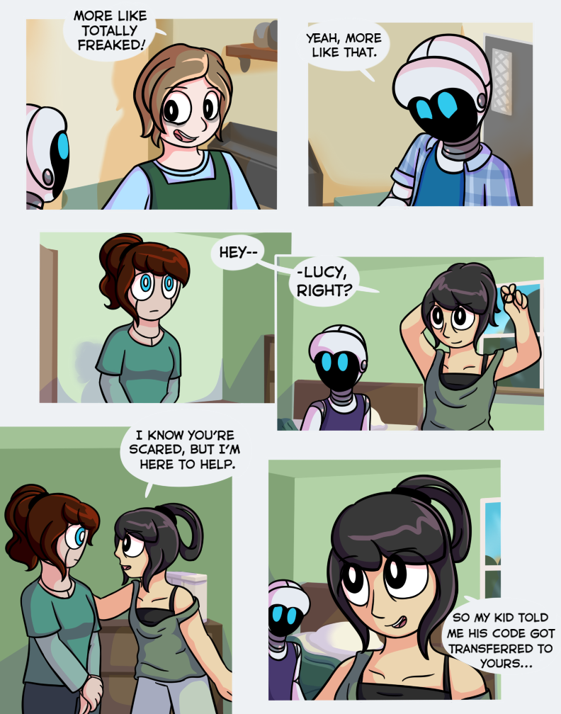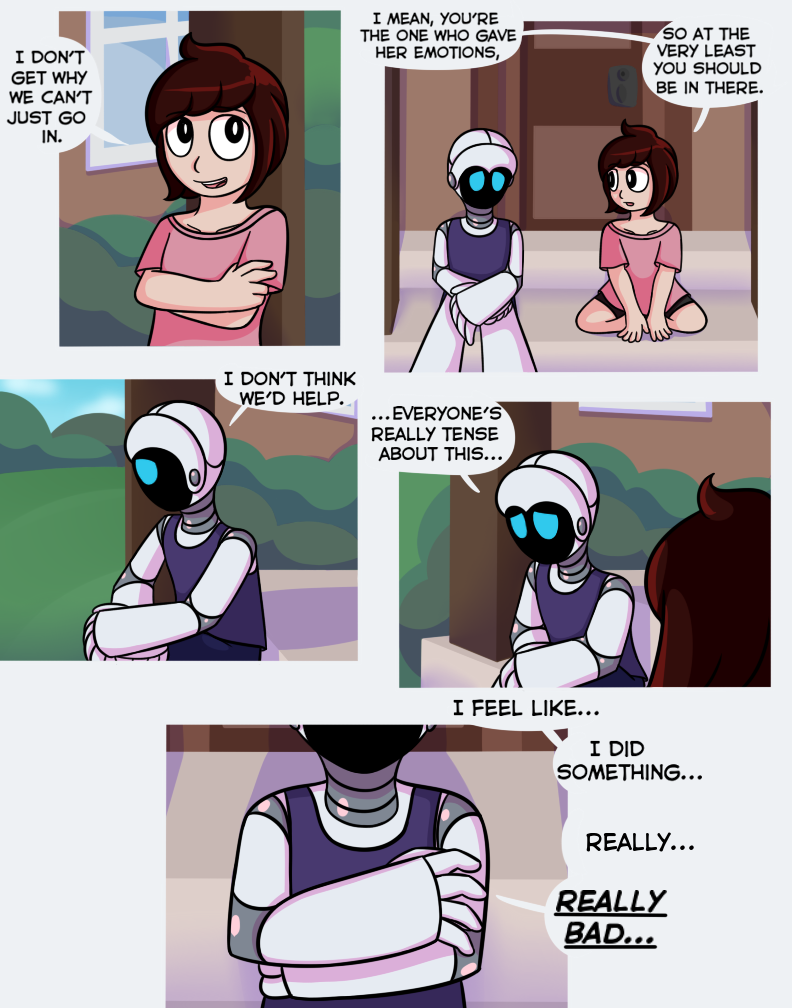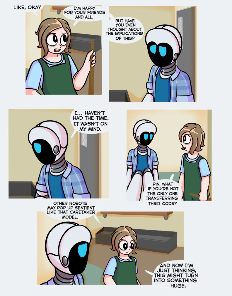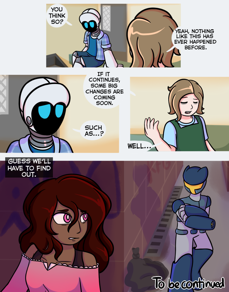 Oh jeez this cant be good. I don't know if I'm even a little right about this, but I think that robot that Pin saw when he was "dreaming" is trying to turn all robots sentient and take over, haha. It's a bit of a common theme so I don't think I'm correct, but even if I am, that would be really cool. :D So, anyways, I'm just wondering, this series is going to be continied, right?