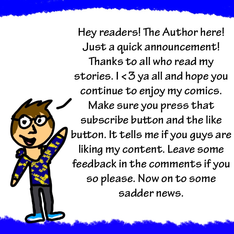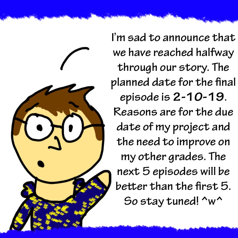 Sorry, had to add a little wall breaking in the series. This was the most fun episode to make for you guys. Again, sry for the sad news. The story will be at it's "the end" 2-10-19. This was only supposed to be a mini-series and there will be more planned in the future. I will continue to make my best work and hope you readers will enjoy it! ^w^ (BTW the next episode will be on Sunday 1-27-19!)