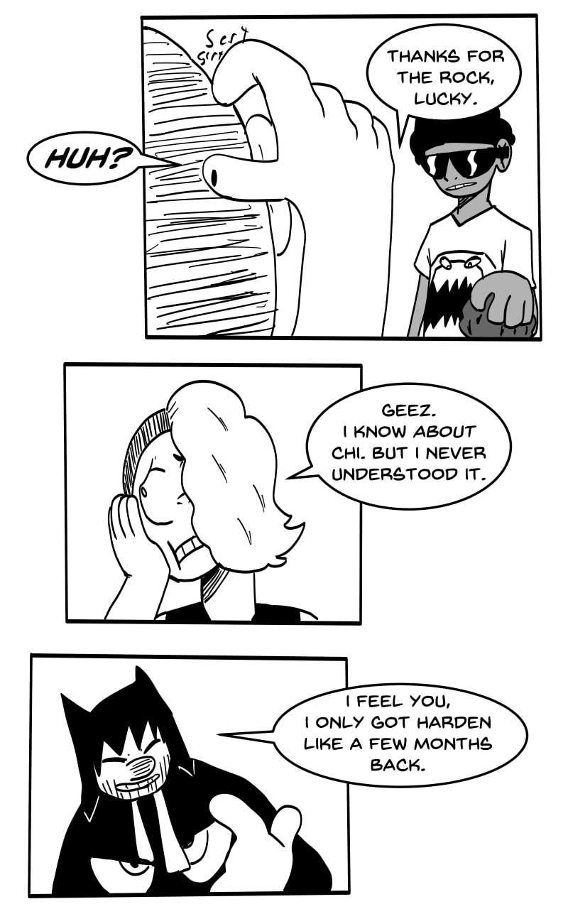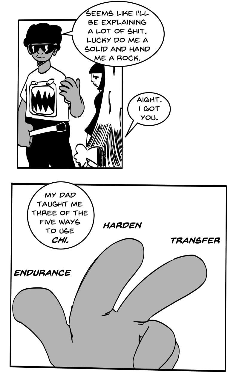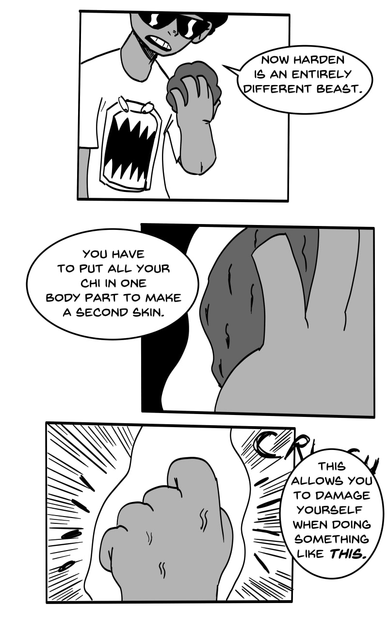 HARDEN: By flowing Chi a certain way to a part of the body, this will put a protective layer around the user. However, using this ability takes away from any other Chi use at the time. If two users use Harden offensively against one another, the first barrier to break down will be the one that belongs to a user of weak will/not using enough Chi.