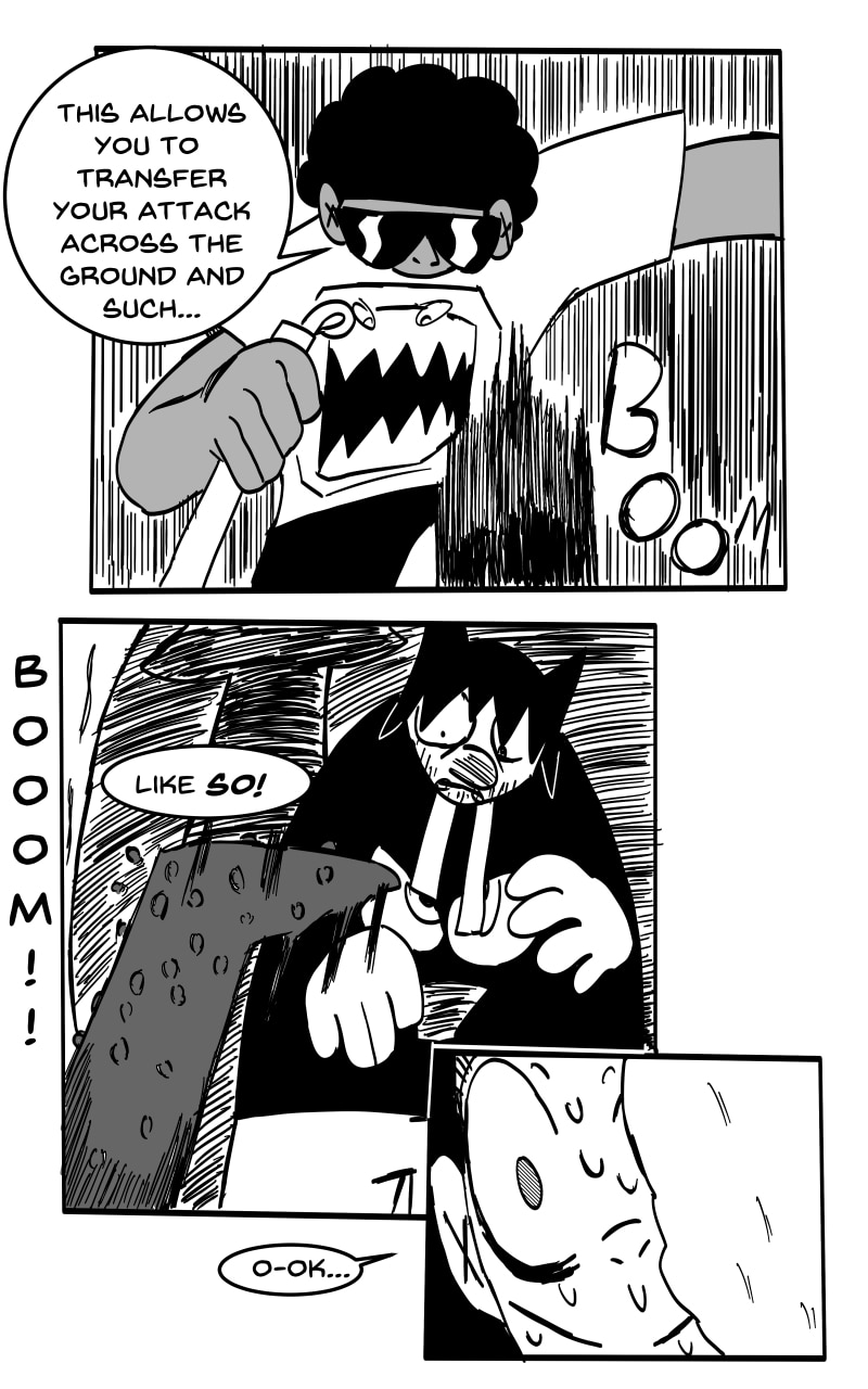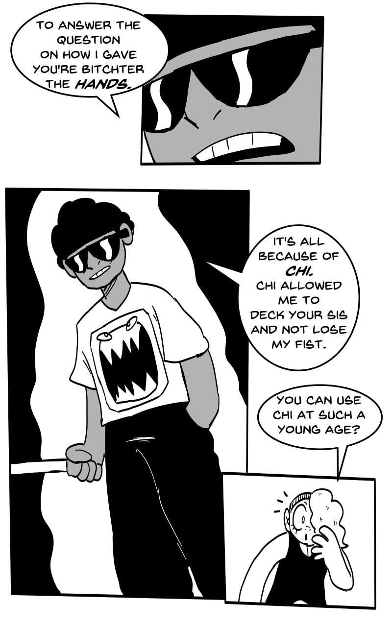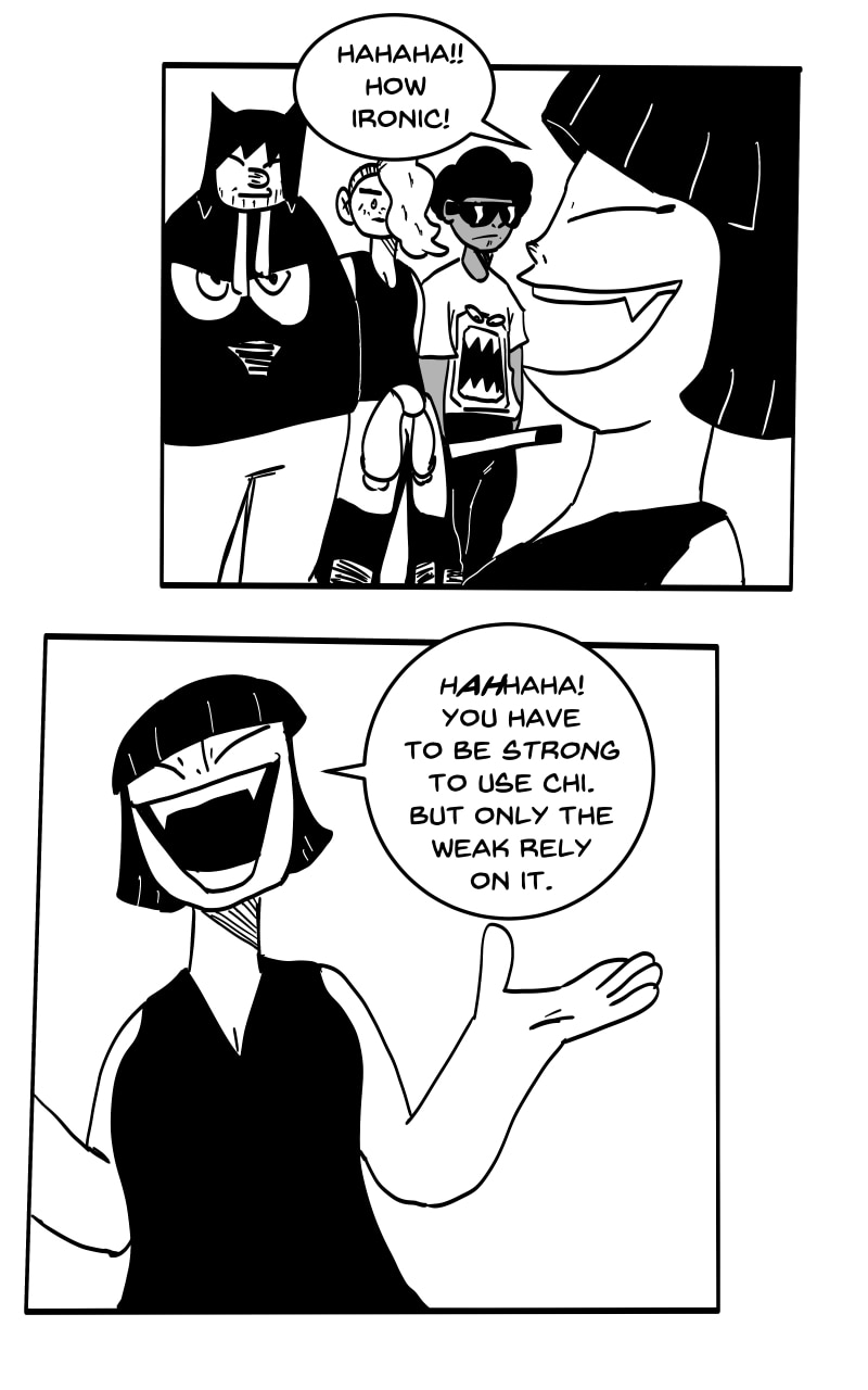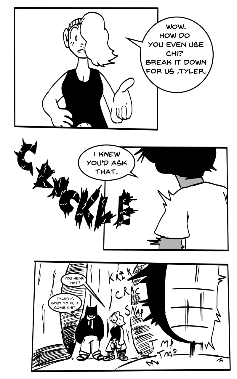 HARDEN: By flowing Chi a certain way to a part of the body, this will put a protective layer around the user. However, using this ability takes away from any other Chi use at the time. If two users use Harden offensively against one another, the first barrier to break down will be the one that belongs to a user of weak will/not using enough Chi.