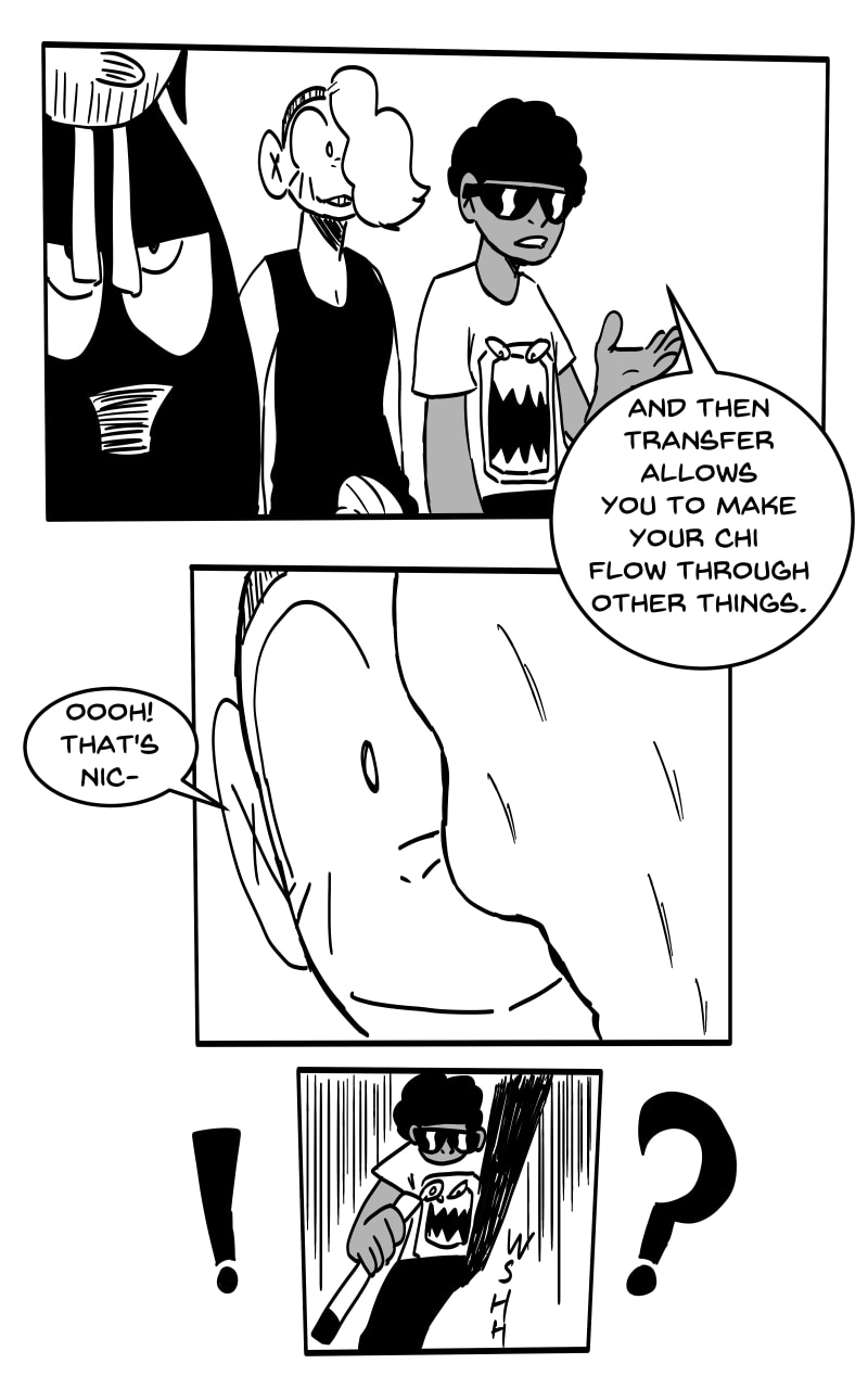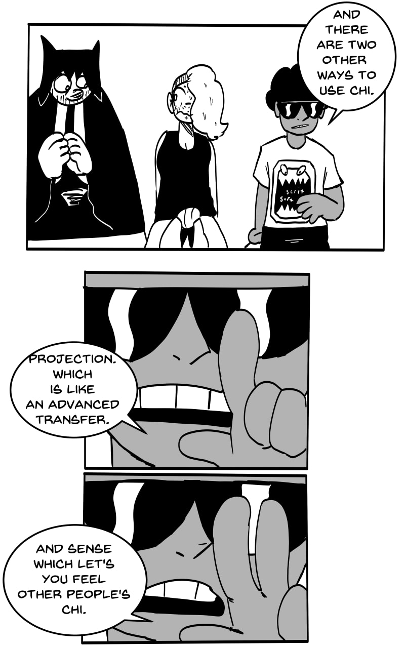 TRANSFER: The ability to make your Chi flow through other beings. Inorganic material is the easiest to do this to. Organic materials with a will are difficult to Transfer through. The more will they have, the more difficult it is to Transfer through them. The Chi Transferred through something is still controlled by the user. All other abilities can be used during Transfer. Ex: Hardening a weapon through transfer.