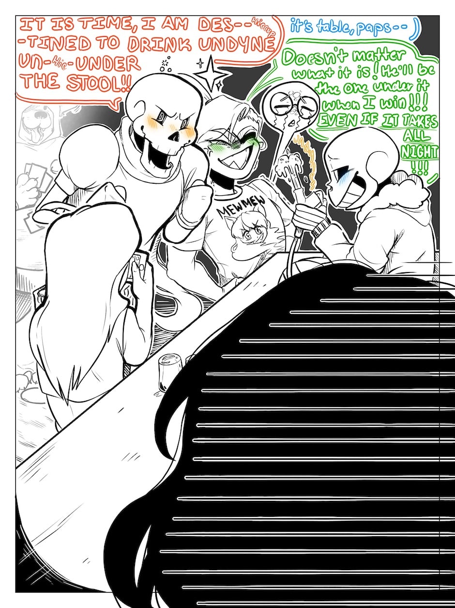 Omg, u draw the best faces ever. XD Also, why is Grillby allowing Sans to be on the bartender side?! Is he just sitting back until Pap and Undyne drink themselves silly? XD