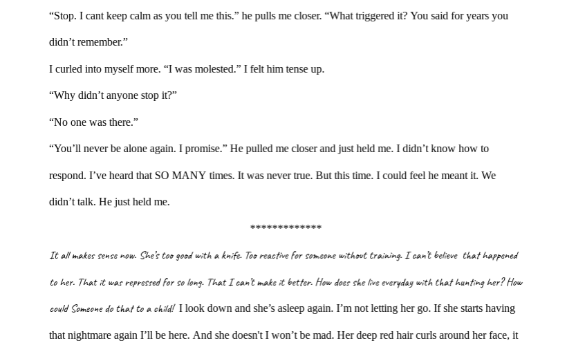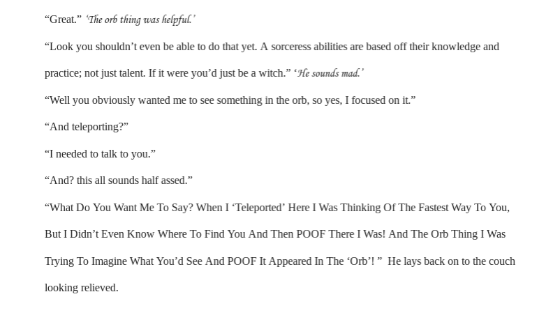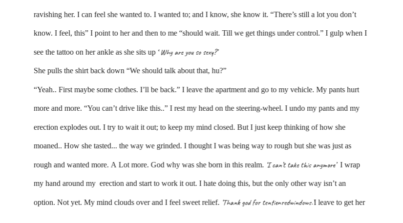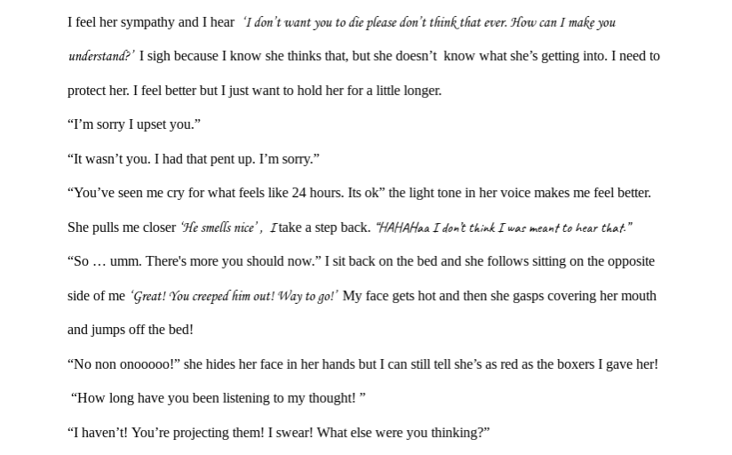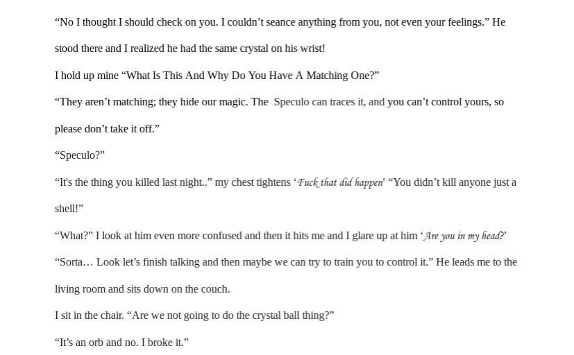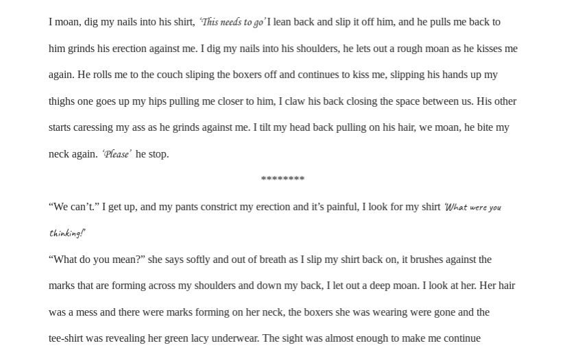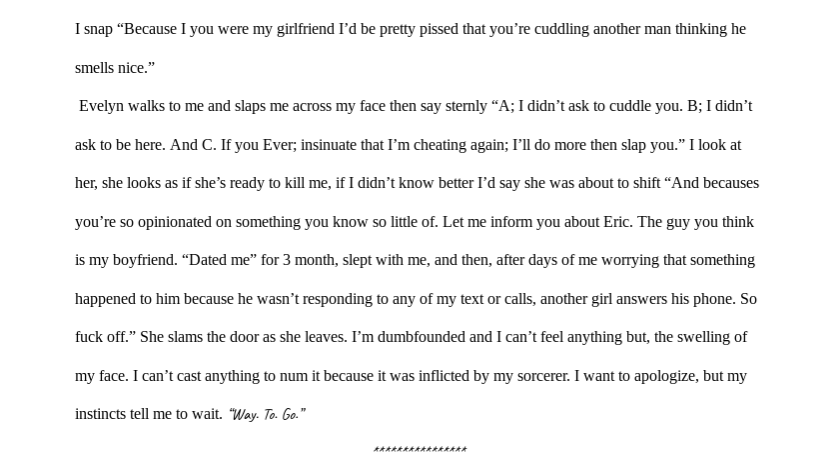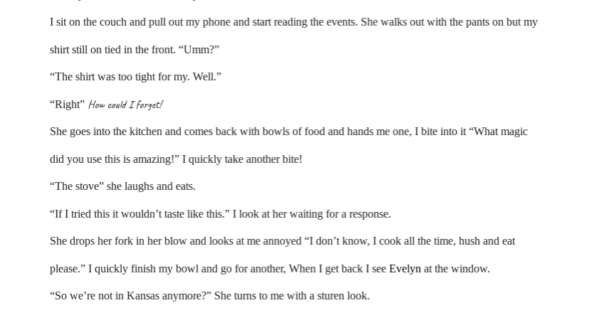 If possible, normal font sizes are going to make it a bit easier to read. As is, via the app or via the computer it is relatively hard to read and it would be more conducive for readers to adjust that small detail. I did enjoy it though <3
