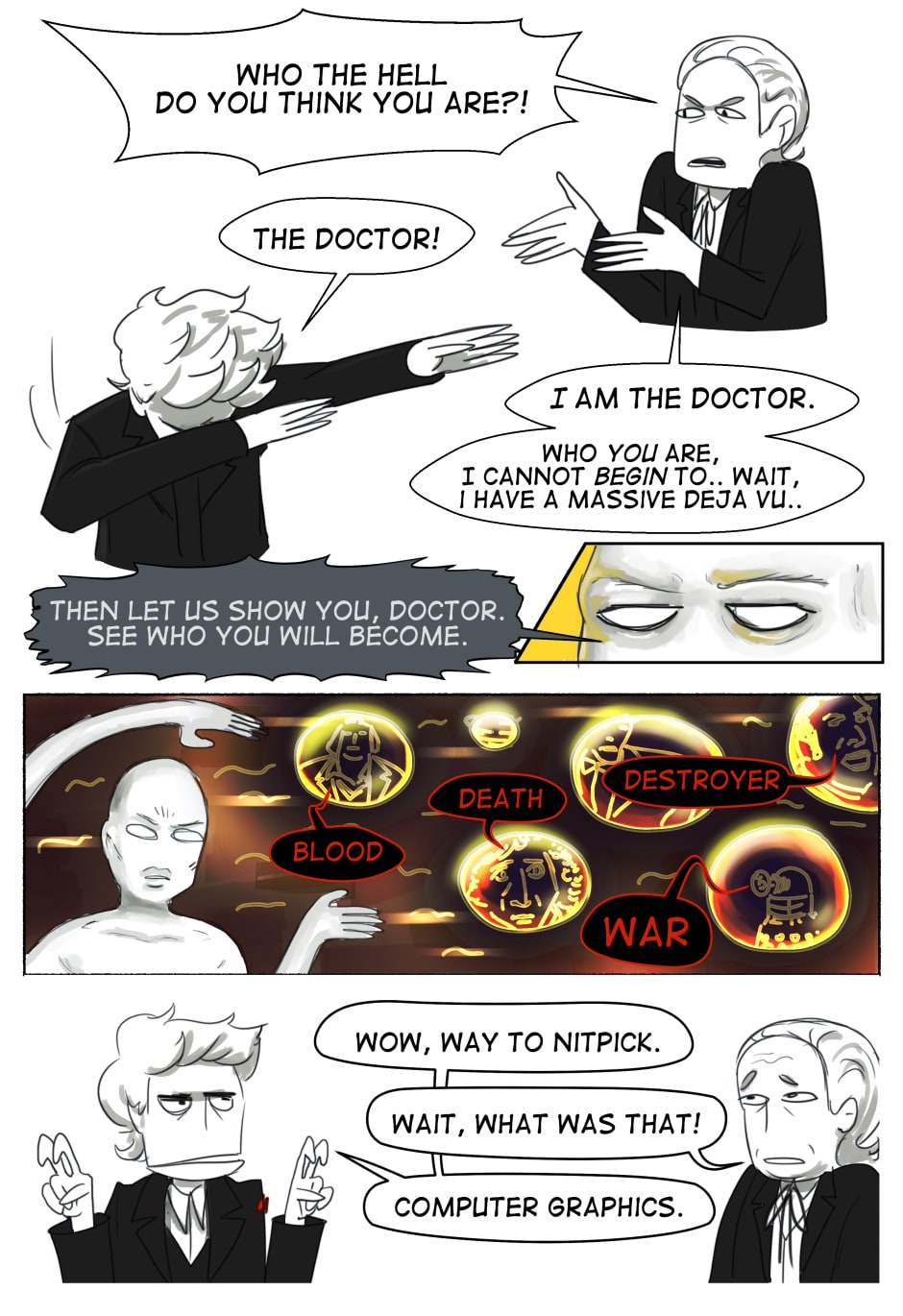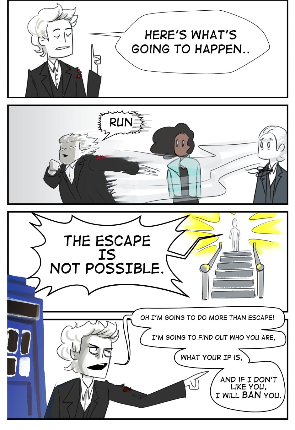 I started drawing parody fan fiction a few years ago because I loved Peter Capaldi's Doctor but hated Moffat's writing. I started with s08e01, but I haven't finished that one yet (oops), so here's the most recent stuff.