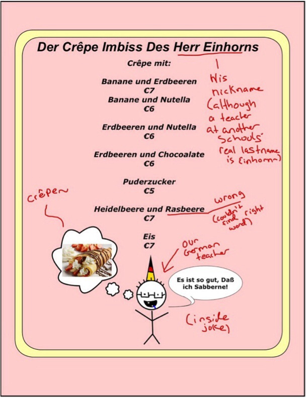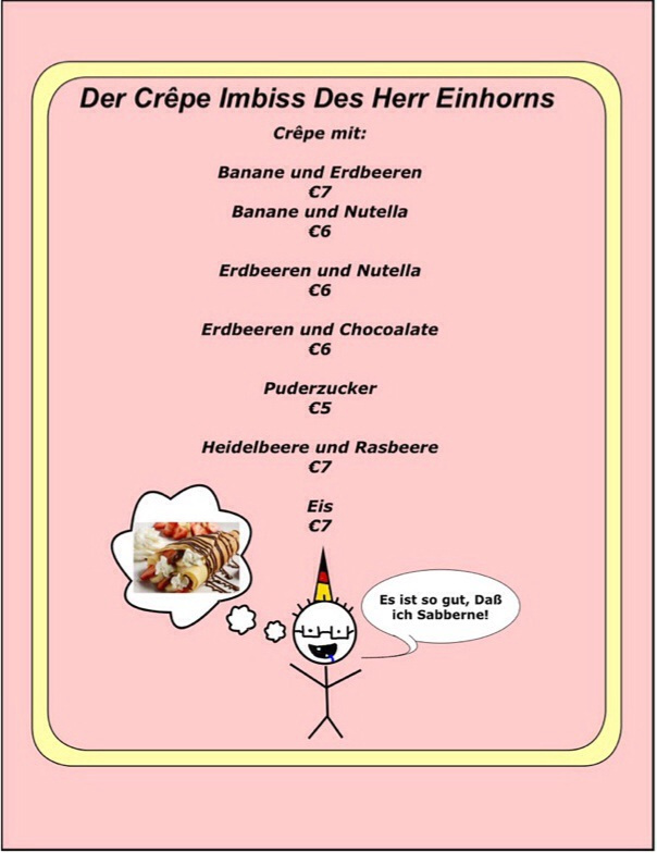 Project we did in German class. The stick person at the bottom is our teacher. That's our inside joke. I started it but idk how it is still going~ Go Herr Einhorn! I have two versions, one with and without writing~