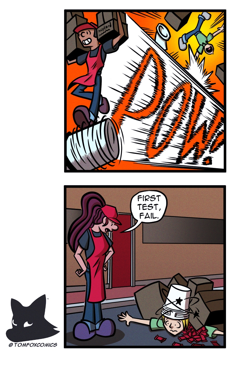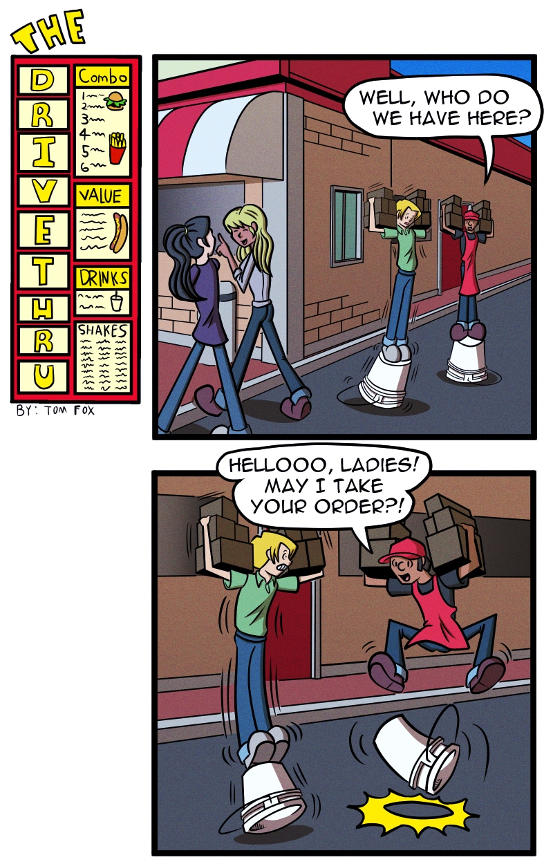 Welcome to Big Tim's, home of burgers, fries, and fun! This strip chronicles the misadventures of BT's lovable crew: Drew, the hardworking egghead. Jimmy, the unflappable ladies' man. Victor, the genius with an IQ of 300. Brooke, the charismatic chatterbox. Brandon, the gentle giant, and Ashley, the ever-sleepy manager.
