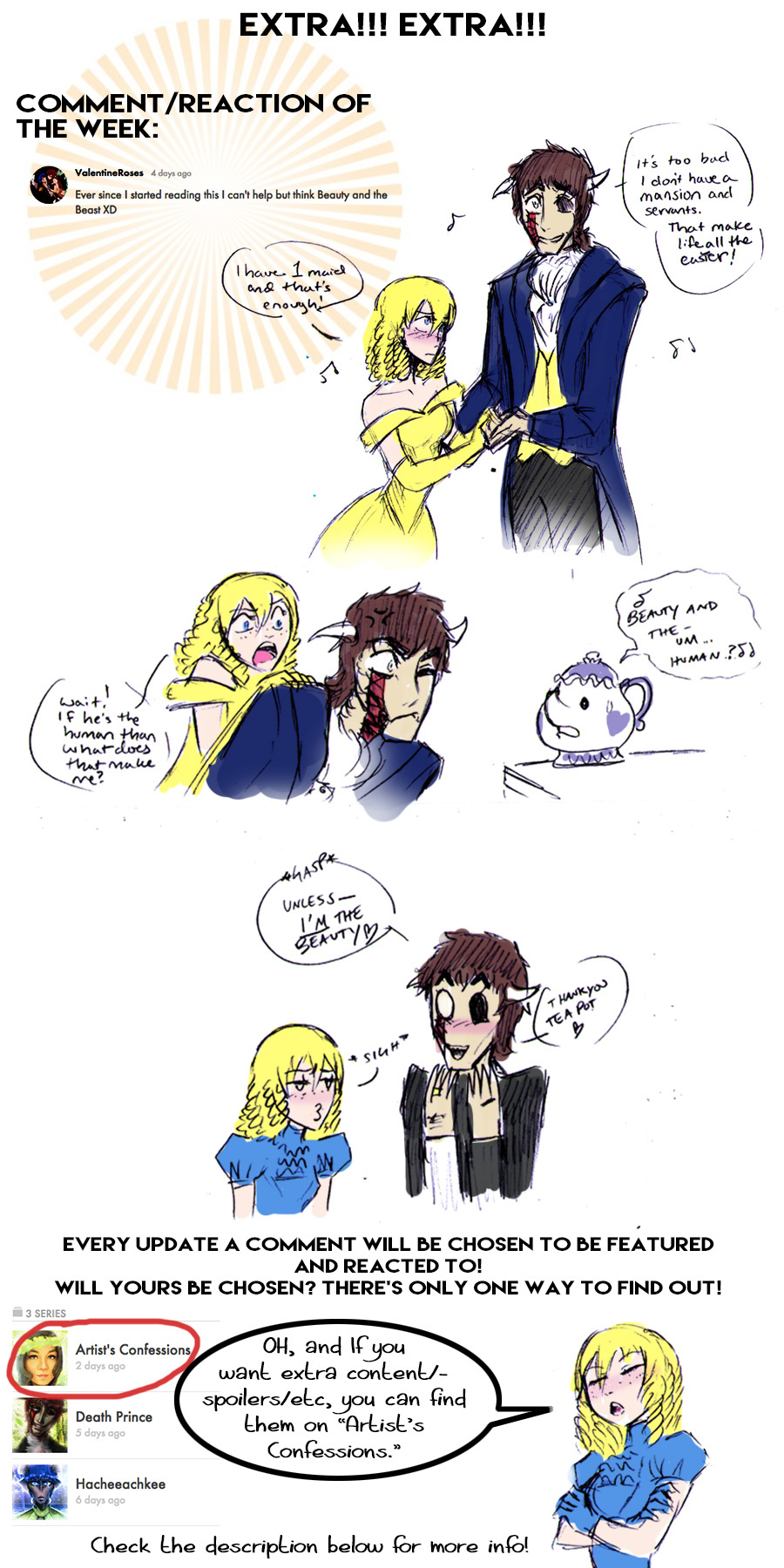 I doubt most of you guise read this, but anyways, if some of you are dying for some spoilers, or even just extra content, I put a lot of that extra content (that technically could count as supporter content) on my side comic: Artist's Confessions, which you can find on my wall. Some of you have convinced me to reveal some of the old works behind this series, and so for ALL OF THIS WEEK, I will be posting old writings to Artist's Confessions. Warning, it contains many spoilers (don't worry, they have nsfw buttons on them in case you accidentally run into a spoiler episode)!