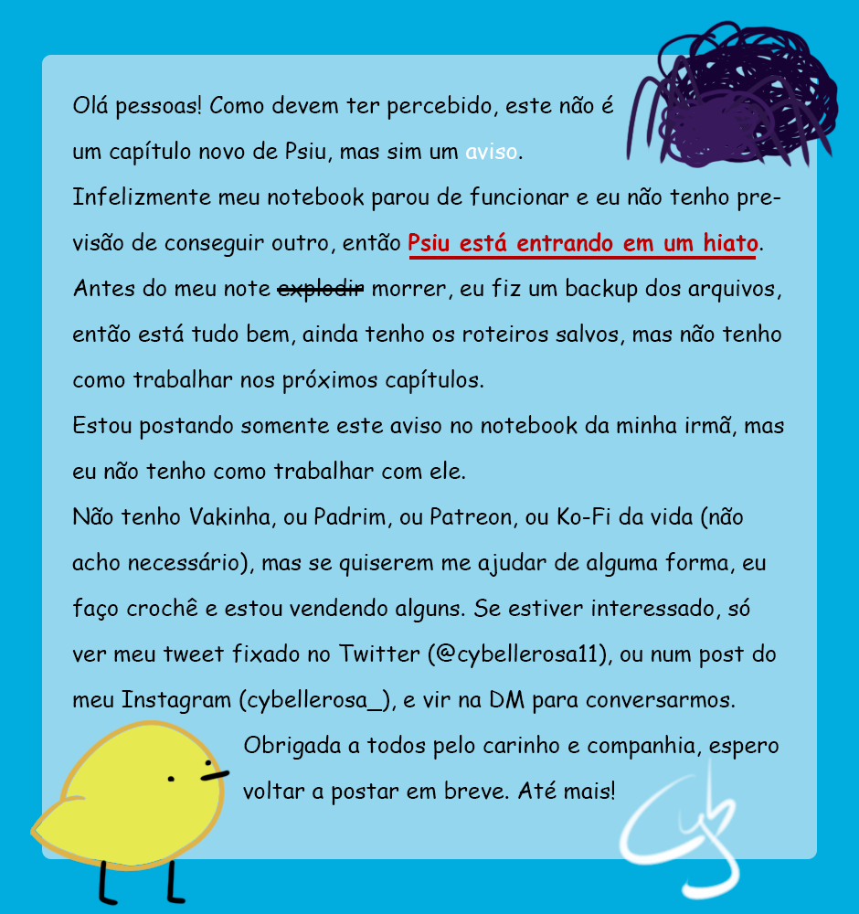 Sim, estou entrando num hiato. Siga minhas redes, caso ainda não esteja: @cybellerosa11 (Twitter), @cybellerosa_ (Instagram). Obrigada pelo carinho e pela companhia <3
