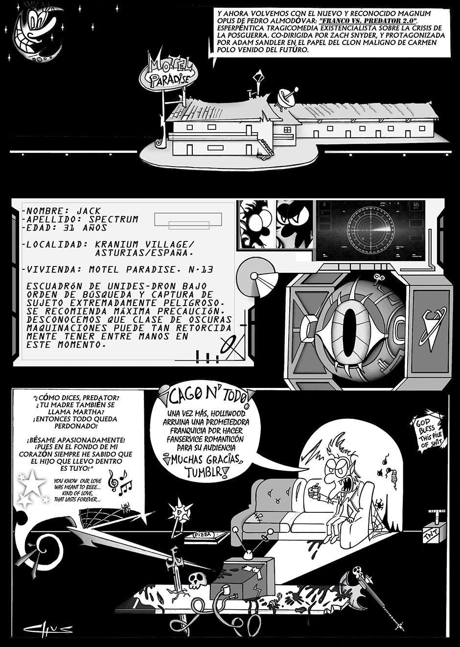 A partir de ahora voy a intentar algo mucho más grande. Las siguientes tiras que voy a colgar, no van a ser gags de una página. Si no que van a formar todo un arco argumental sobre como Jack, finalmente es detenido por todos sus crímenes y enviado a una Prisión de Máxima seguridad para delincuentes Paranormales.