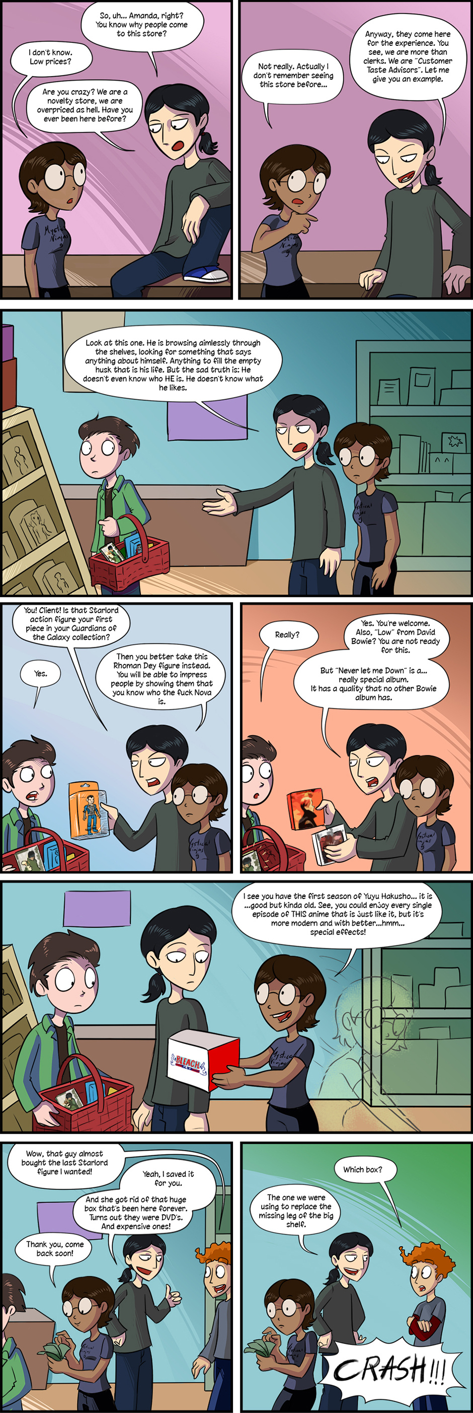 Blind Alley is a dark comedy comic that follows the lives of employees, clients and drifters in one of the largest shopping malls in existence. There they can find anything they need, but some that come in find more than they bargained for… although usually they just get a low paycheck or shady deals on surplus.