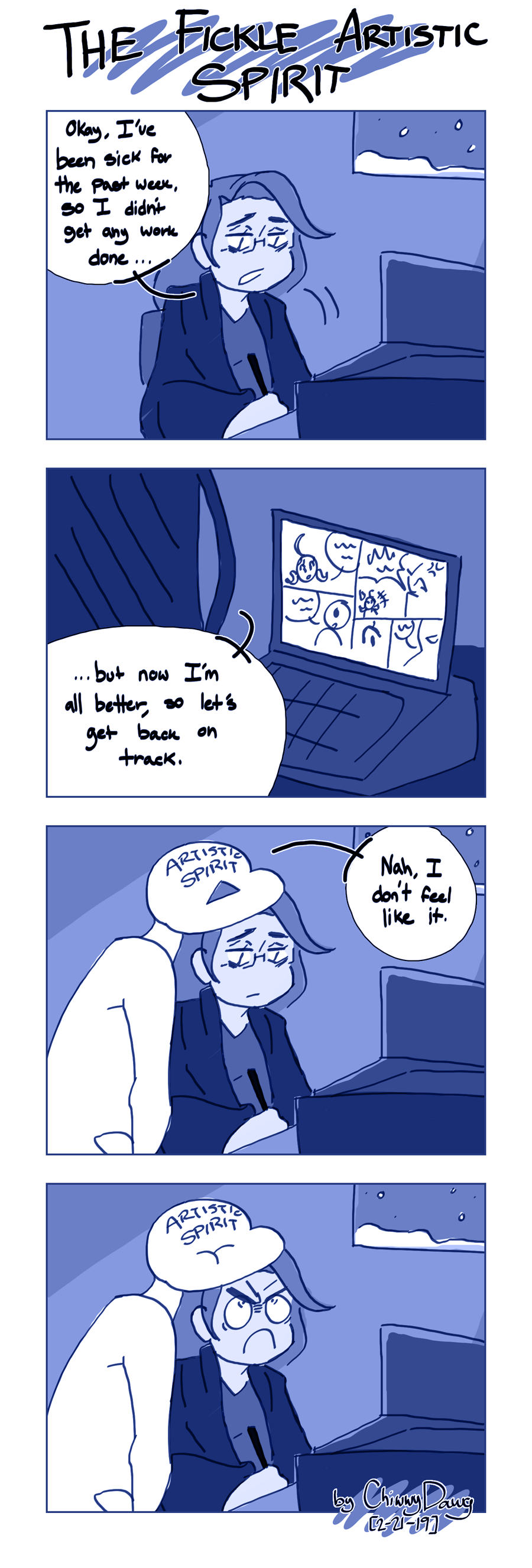 I'm like a shark. I can't stop moving, or I'll die...or at least, my motivation will die. (Original upload date: 02/21/2019) https://www.deviantart.com/chiwwydawg/art/The-Fickle-Artistic-Spirit-786663902