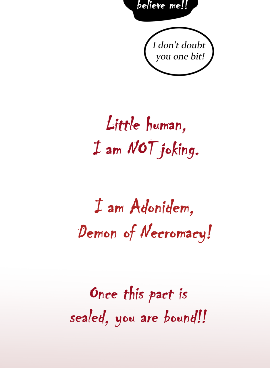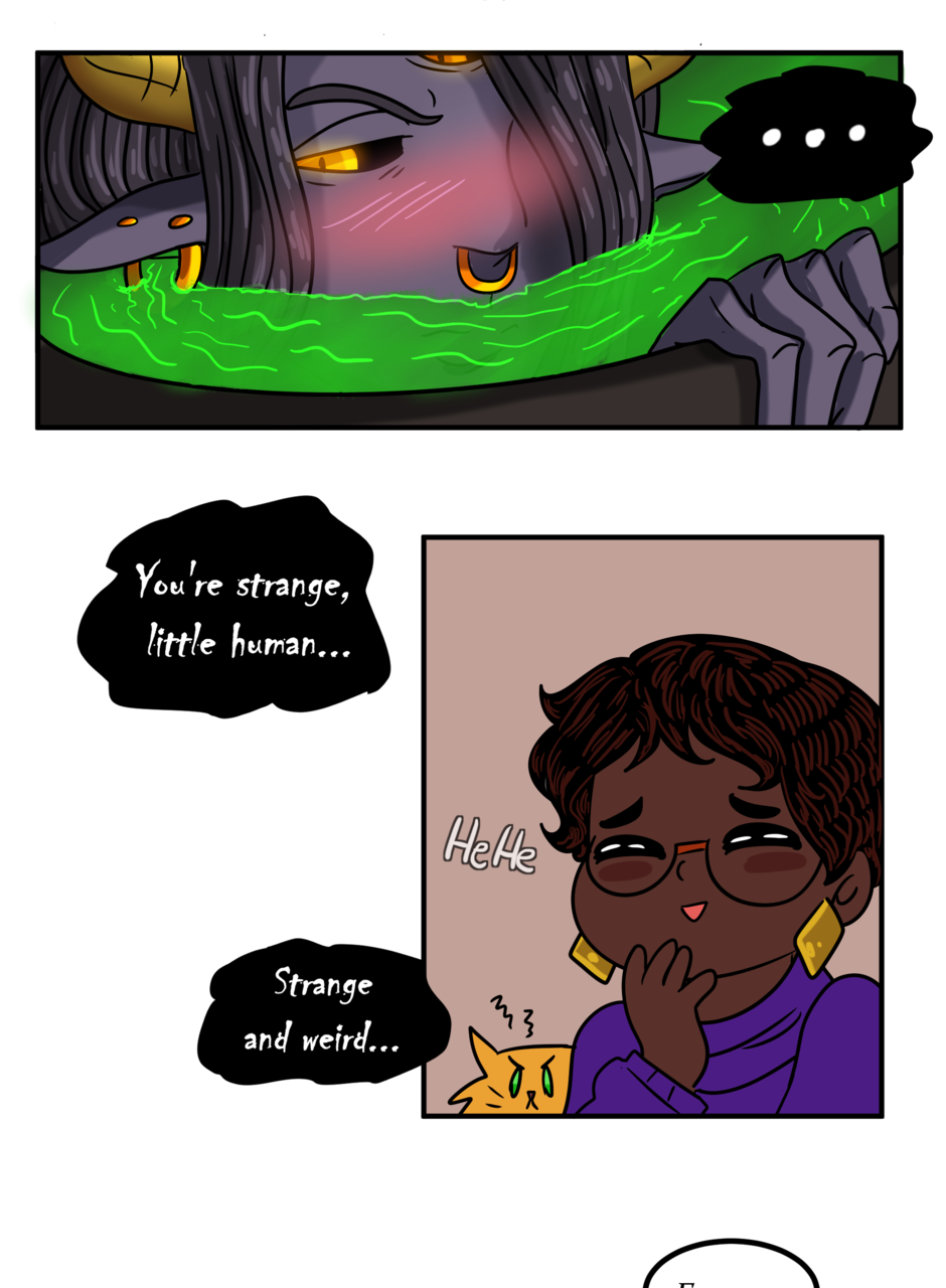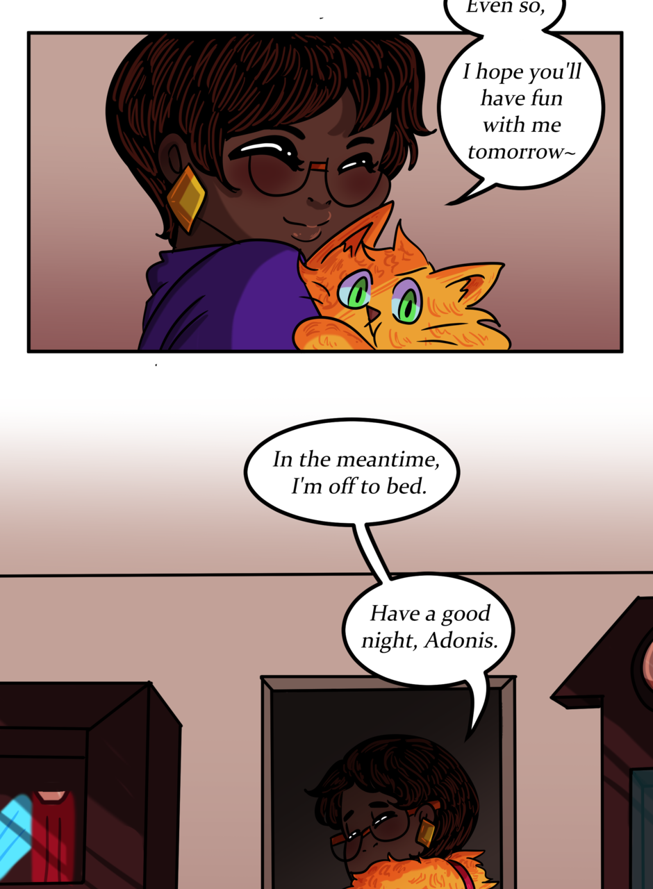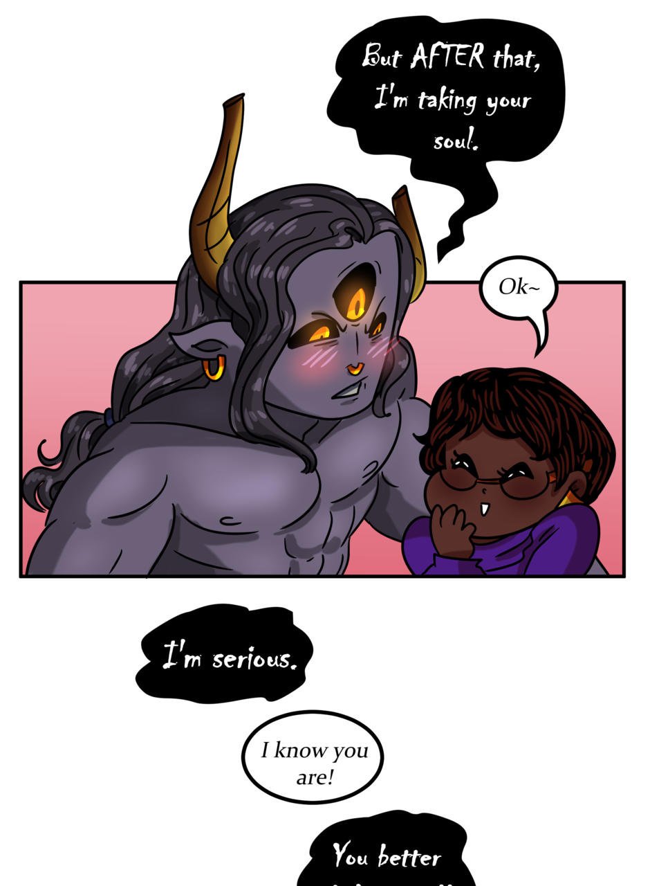 Omitted Dialogue: Adonis: I will take your soul to swirling fiery pits and cursed existences. Sandra: -finger guns- Kinky. -- Hi there lovelies! I hope you've enjoyed this update! There should be another update coming next week, so stay tuned~