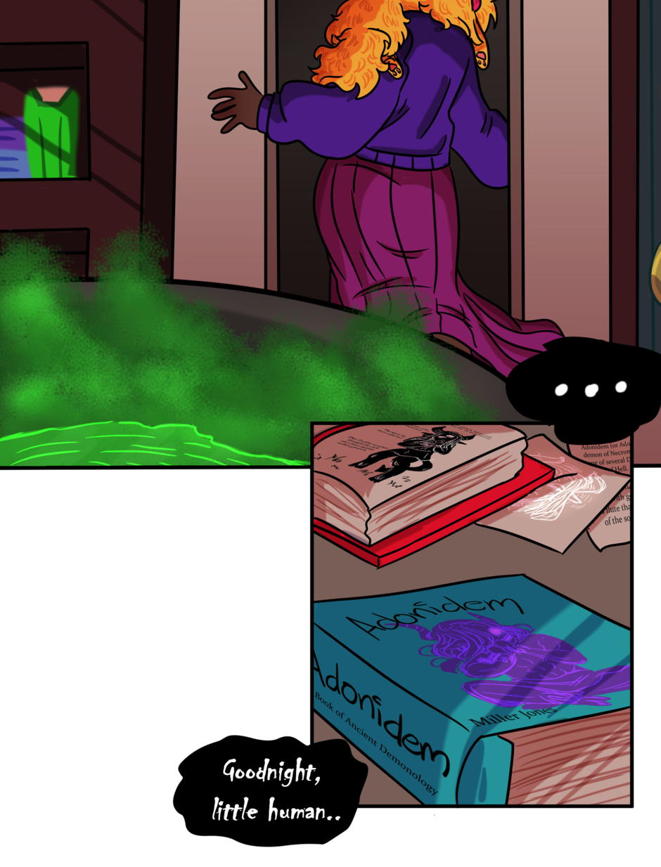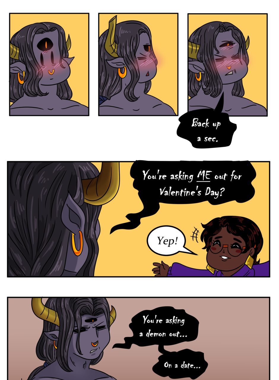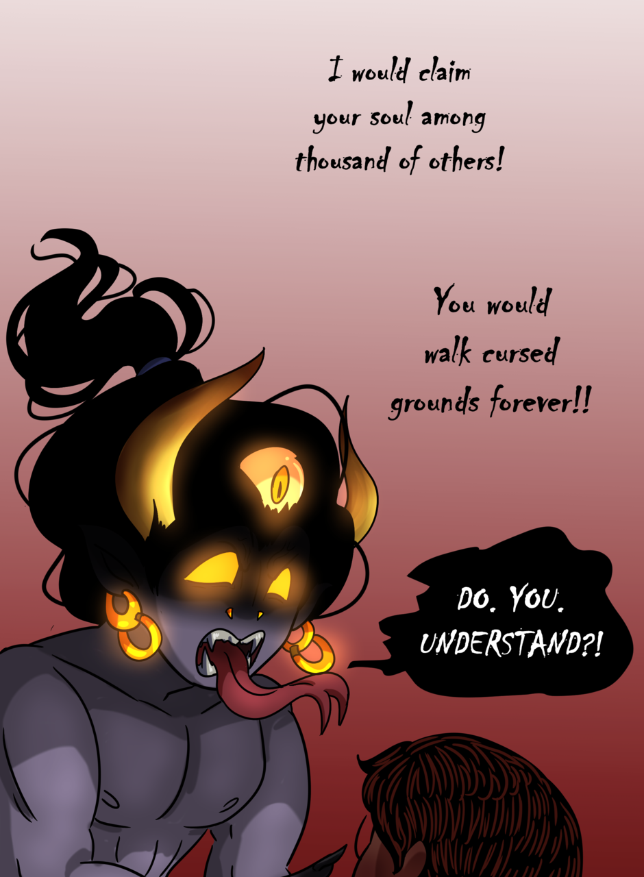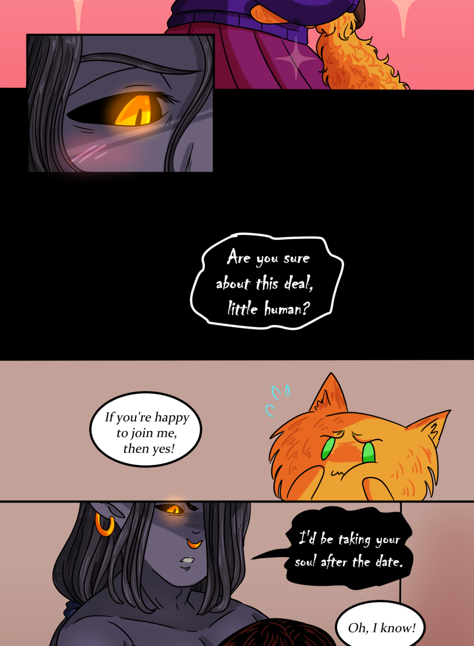 Omitted Dialogue: Adonis: I will take your soul to swirling fiery pits and cursed existences. Sandra: -finger guns- Kinky. -- Hi there lovelies! I hope you've enjoyed this update! There should be another update coming next week, so stay tuned~