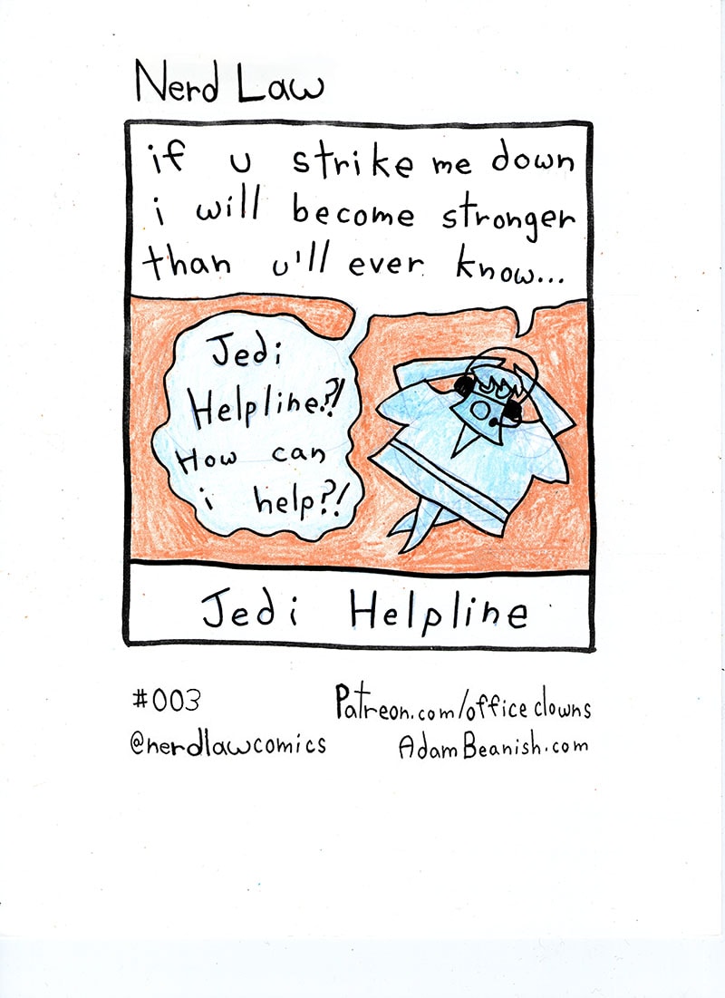"Jedi Helpline?" #NerdLaw #NerdLawComics #JediHelpline #jedi #obiwan #starwars #callcentres PAY MY RENT! Patreon.com/OfficeClowns AdamBeanish.com @adambeanishart