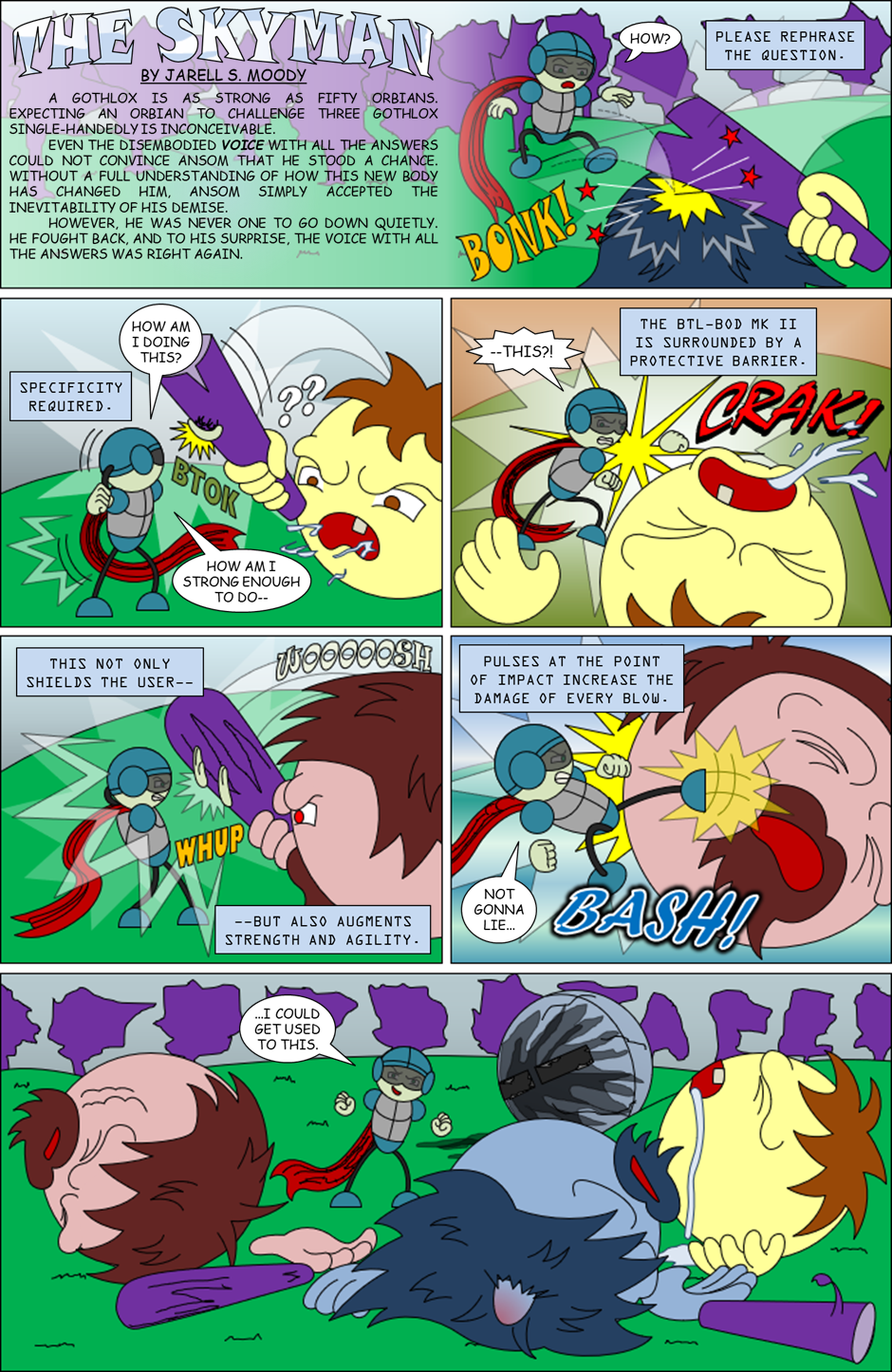 When an object from space crash-landed on the planet Melisma, a nearby terrestrial by the name of Ansom Ero elected to explore the resulting rubble. He discovered a robotic body inside an alien structure, which he merged with, turning him into The Skyman!