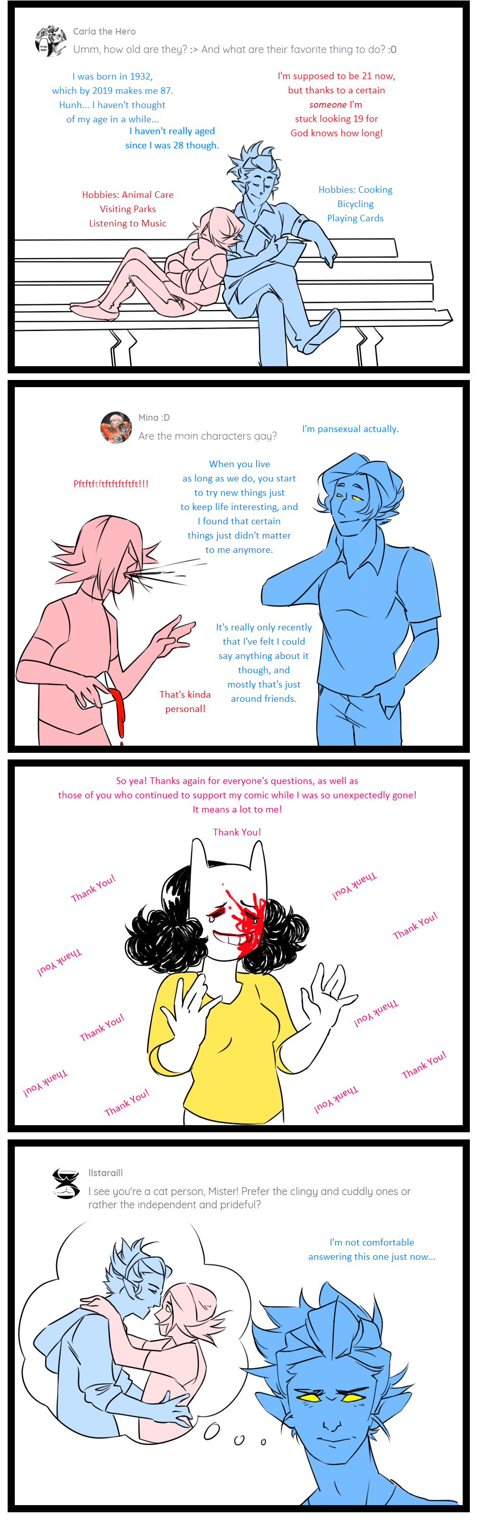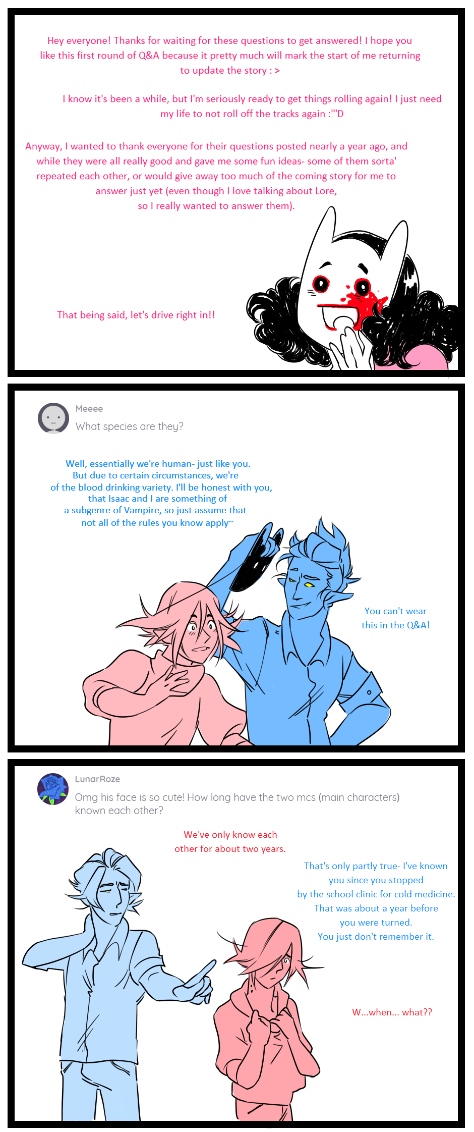 If I didn't answer yoru question, it wasn't because it wasn't good enough! Actually, some of the ones I didn't answer were VERY good- but would have taken too long to explain, and/or would have given away things that you will learn shortly in the next few pages, or scenes!