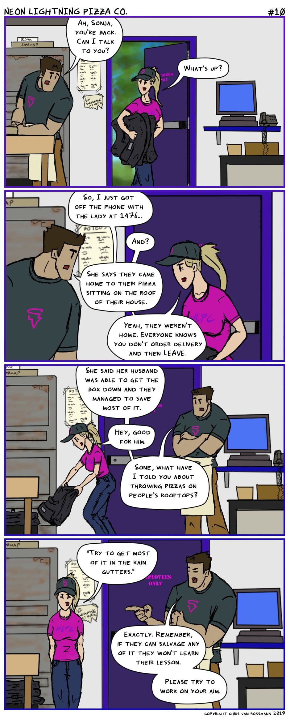 Delicious pizza. Obnoxious customers. Annoying coworkers. Murderous soda robots. Find all of these things and more at Neon Lightning Pizza Co, the Pacific NW college town pizzeria where the food is amazing and the service is downright abusive!