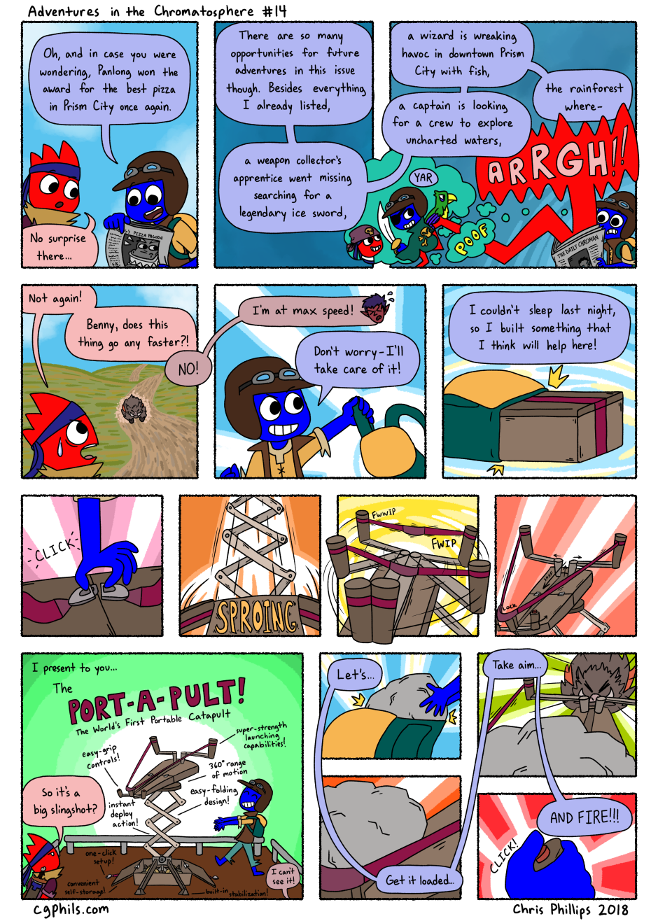 Indy unveils a new invention to deal with an old problem! Page 14 of Adventures in the Chromatosphere! Updated website link: https://chromatosphere.com/pages/page14