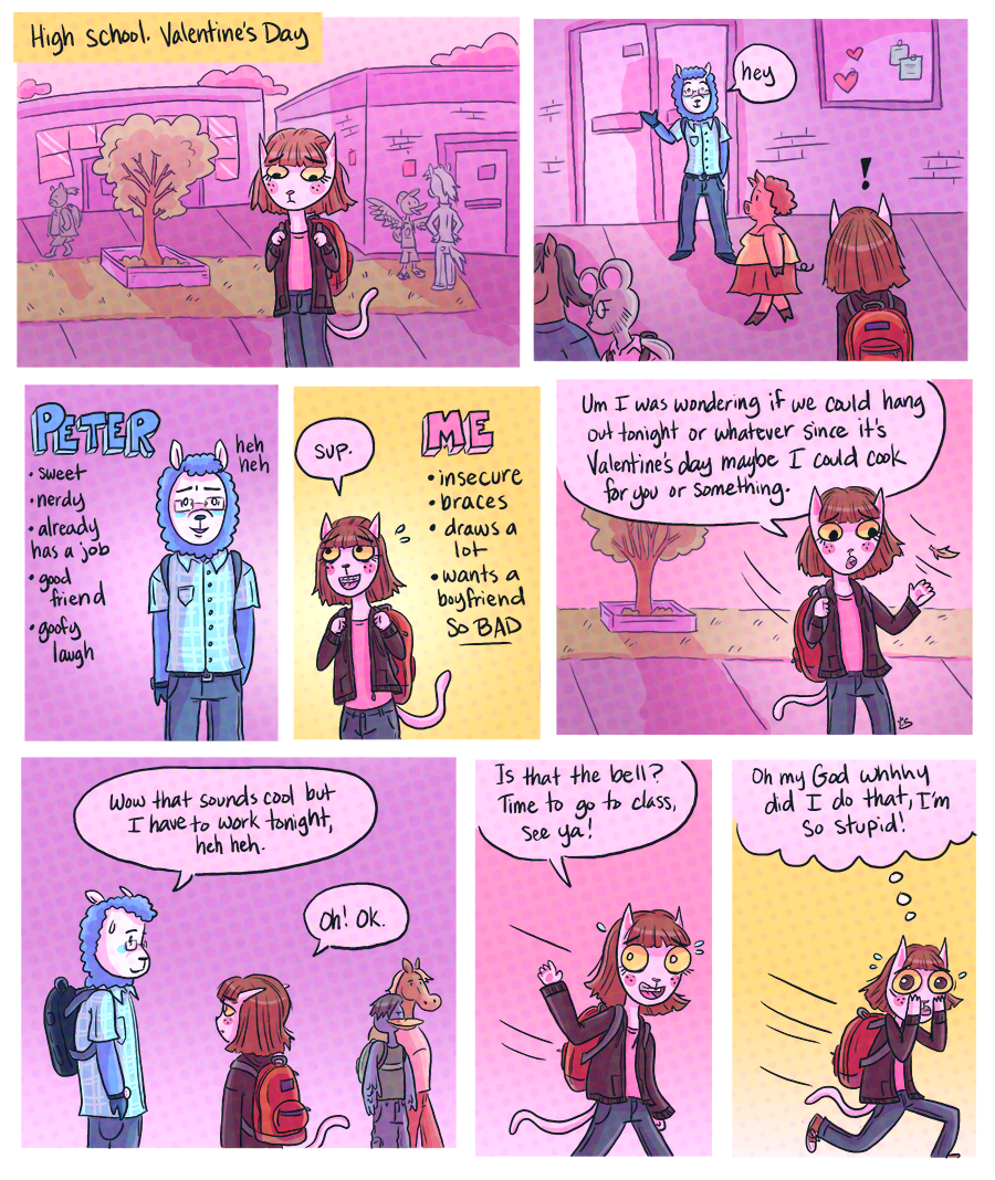 Yup, this is sad little high school me. And my high school crush as a llama! I felt like drawing this random memory because I thought it was kinda cute. Part 2 coming soon (it's only 2 parts) Most of the comics here will be short stories.