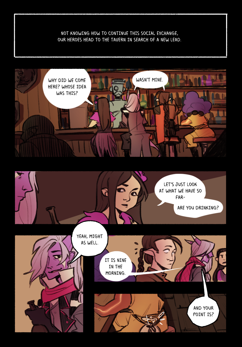 Four (and later about 6) travellers find friendship in each other and bond over various inappropriate situations. A series of comics retelling some stories from our D&D campaign.