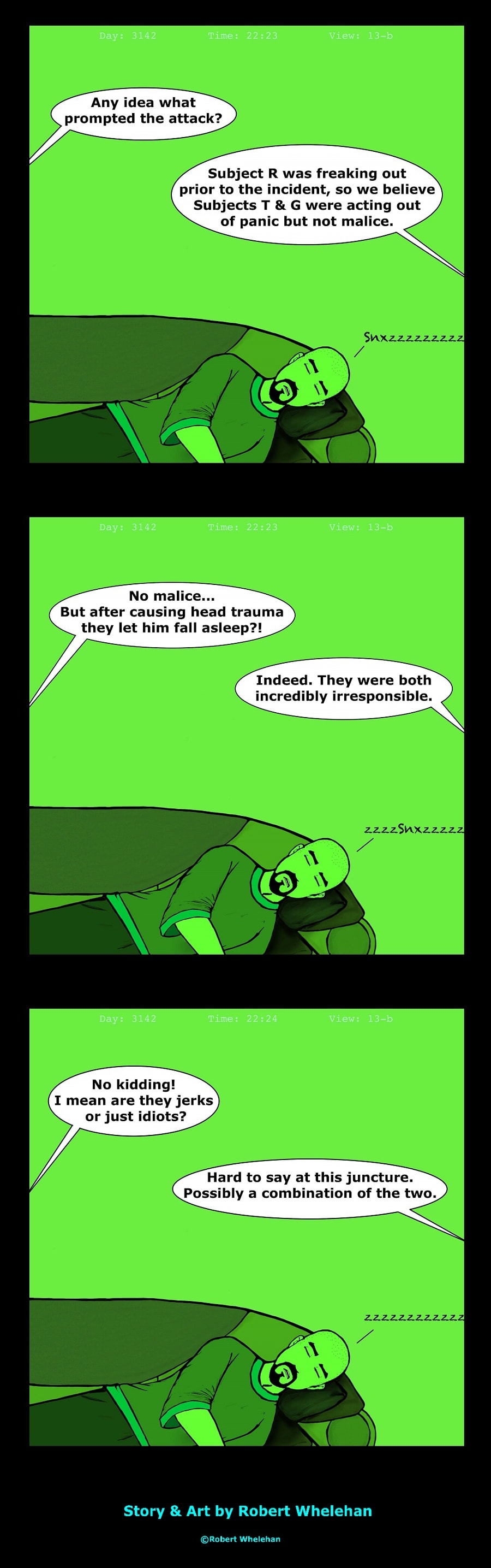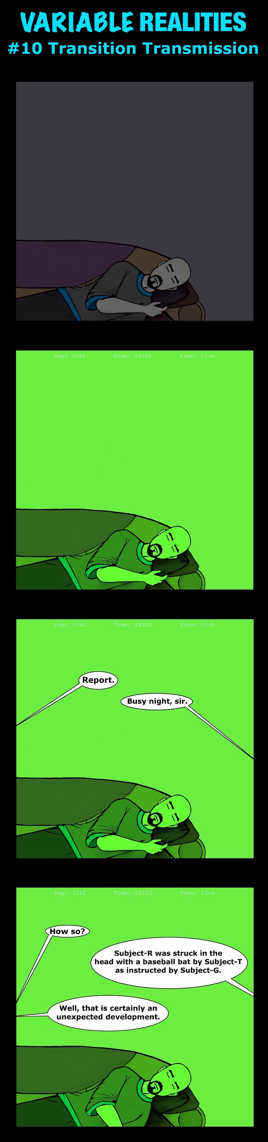 #10 Transition Transmission Transition from one scene to the next, as a Transmission of a mysterious nature spies on Rob sleeping for some reason.