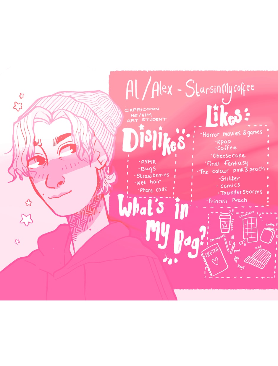 Alex is an illustrator and comic artist with a love for pretty things and the colour pink. He loves to mess around with colour palettes, watercolours, and glitter occaissionally, but his main focus is drawing people.