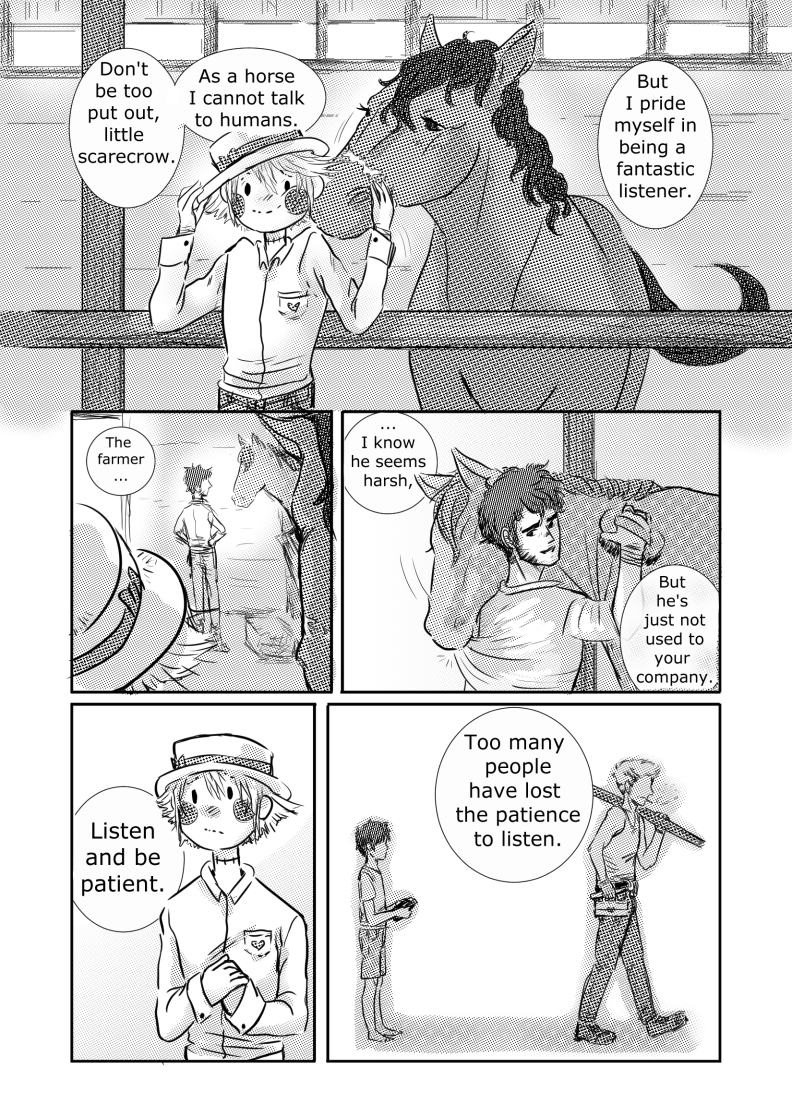 The little fella insists on following him everywhere! His attempts at pushing him away or ignoring him seems fruitless and before he knows it, he develops a little soft spot for the little guy made of straw.