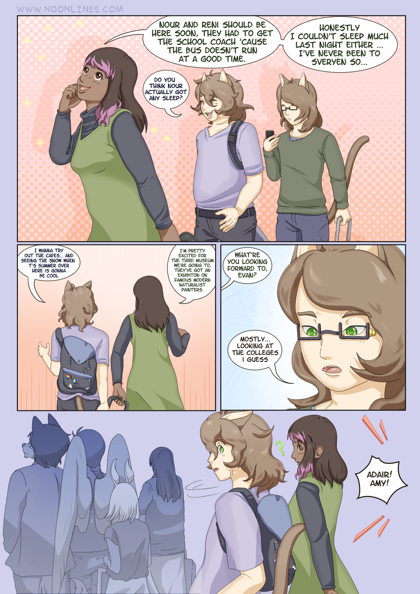 Noonline is a webcomic following Adair Thayer, the young God of Time, and his friends as they unearth a bizarre and sinister conspiracy hearkening back to his childhood, whilst attempting to navigate the stress of exams, college applications, and teenage drama. Joined by Amy Newell, his oldest friend and the voice of common sense in the group; Junko Makimoto, the mysterious, socially anxious God of Space; and Glice Deniau, a descent of a long-dethroned royal family.