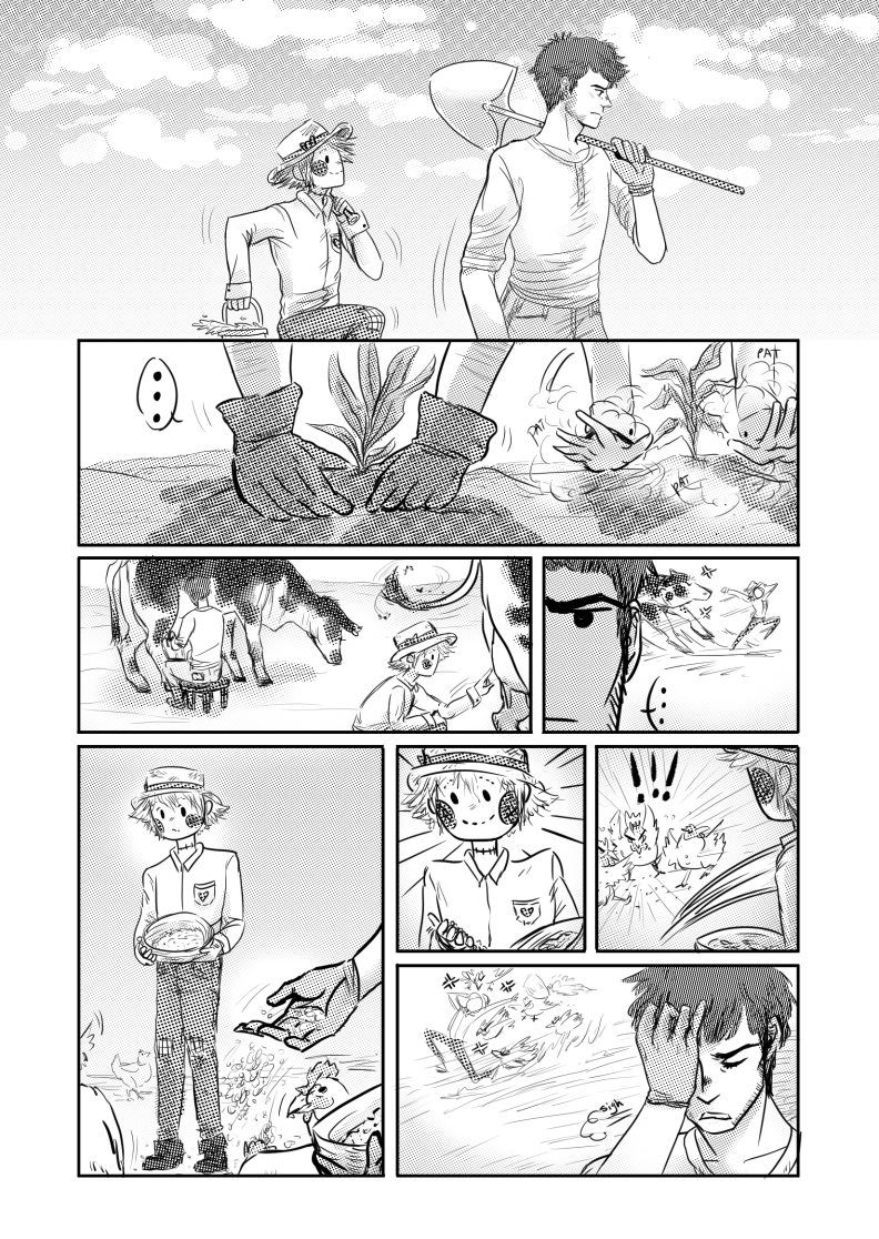The little fella insists on following him everywhere! His attempts at pushing him away or ignoring him seems fruitless and before he knows it, he develops a little soft spot for the little guy made of straw.