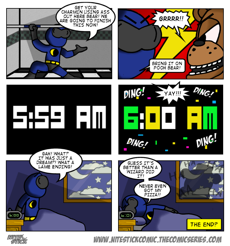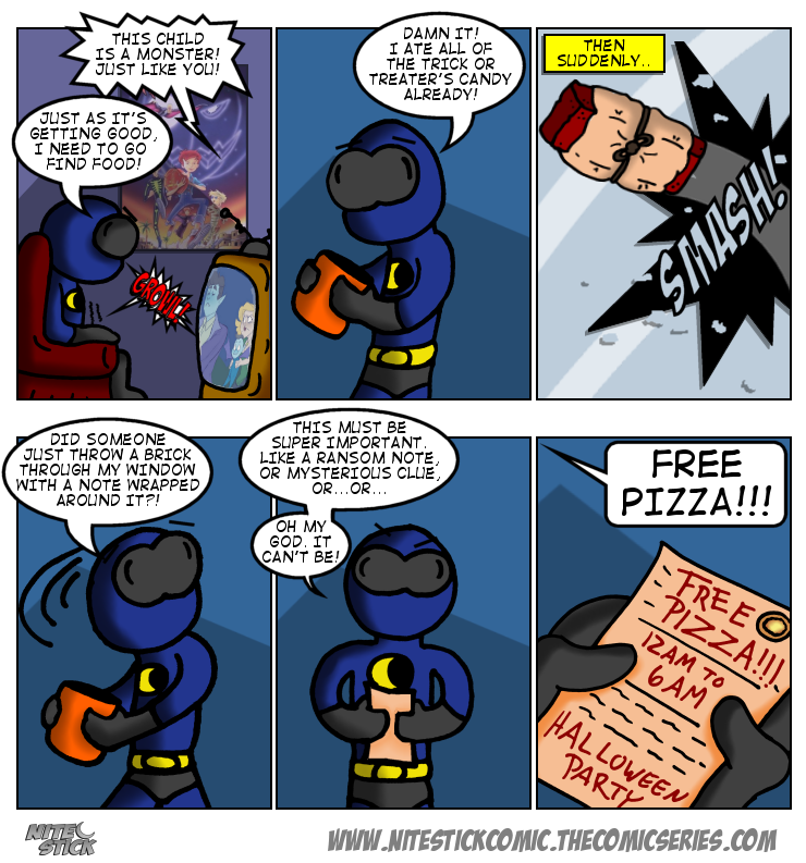 The Halloween issue finds Nite Stick stranded for the entire night at a run down pizza joint with killer robots