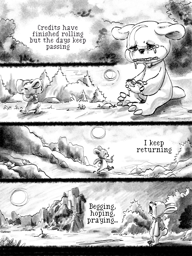 I must say, I am somewhat happy to see that chapter 6 is the end. This is every child's fear that you are drawing at the moment. The fear of being abandoned. And this is every child's reflex as well, going back to the place where you have been abandoned. This is very visceral, it takes your mind and brings it back to a developmental level you thought you have evolved out of. I don't know whether you have ever read "The Velveteen Rabbit: Or how Toys become real", it is a similar tale about growing up, leaving behind and abandoning our childhood (as opposed to being abandoned in your own tale). The emotions it elicits are very alike. You are doing quite a good job with this. I feel you would be good for that niche of comics where naïve art is used for a more adult plot.