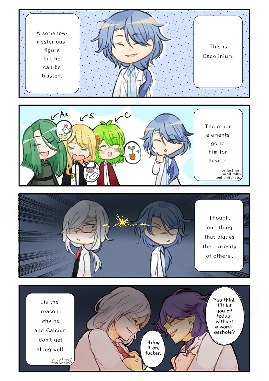 Gadolinium, a doctor who may seem mysterious to anyone around him. Arsenic - ame (@nijiiroparade) Sulfur - gill (@ethylwave) Carbon- mikka (@suzu___oto) Calcium- ren (@_mirurukun_)