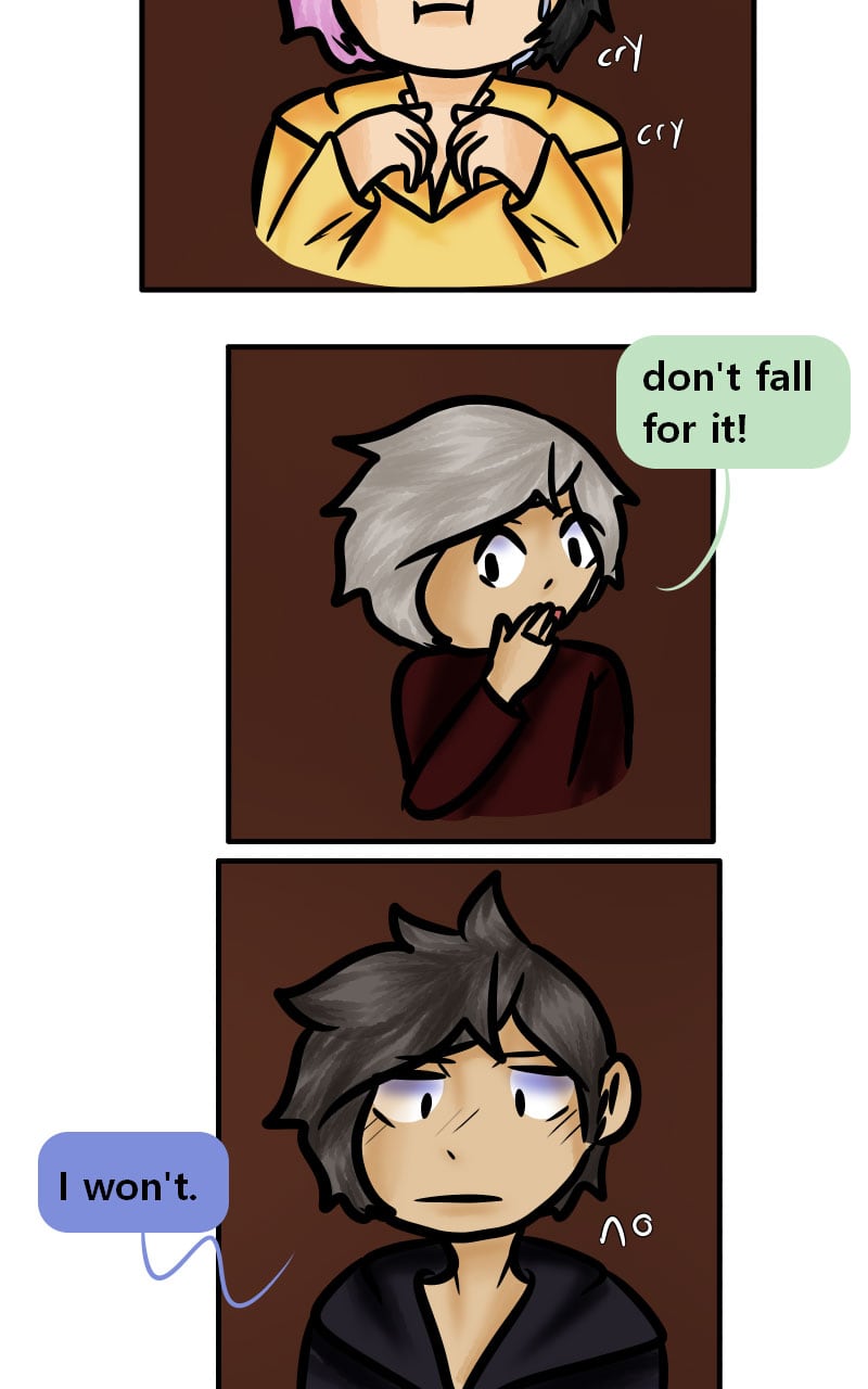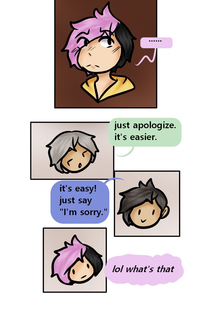 (In my head) "It's easy. Just say you're sorry." "Es tut mir nicht leid!" "Saying 'No I'm not sorry' in German is not helping your case! J-just suck it up and apologize!" "NEIN! NEIN! NEIIIIIIIIIIIIN!" (No, means no) [Read: Please keep up the good work!]