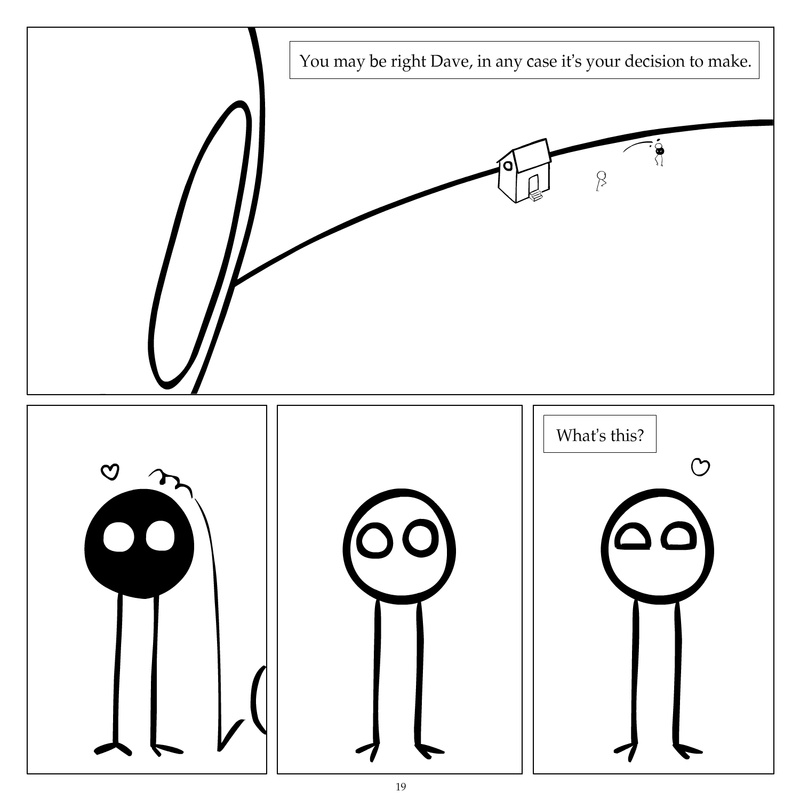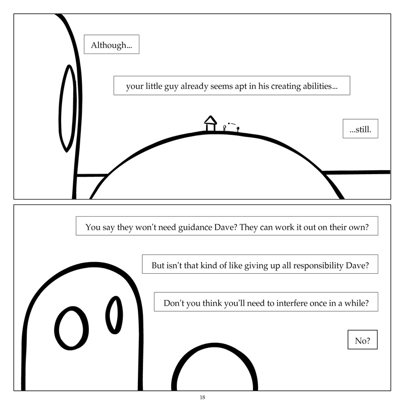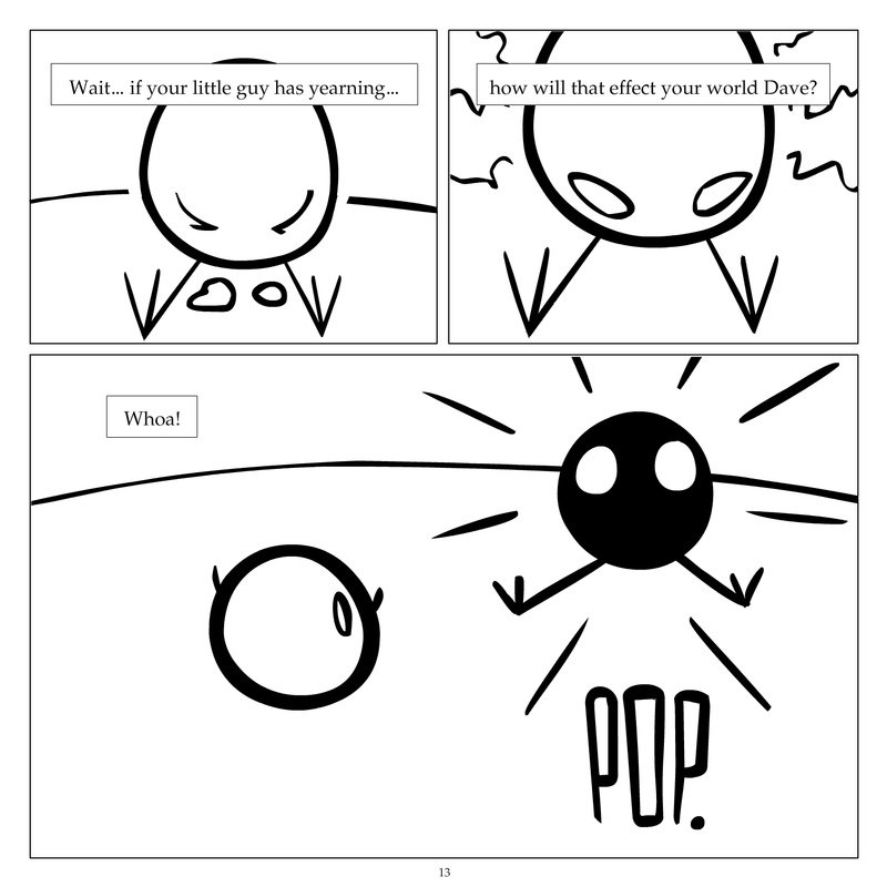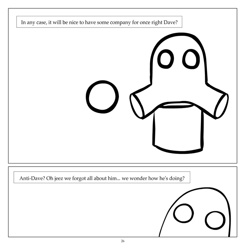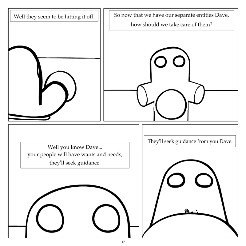 Dave's Wurld is a completed series about a child-like being living in an empty wurld. Dave has just discovered he has legs, and already he is on a journey of discovery, first to seek a shiny object which may or may not exist, and then to seek his purpose. Dave's Wurld has humble beginnings, but a simple act from Dave explodes into a universe of people and places, as well as Dave's rival, Anti-Dave. Dave will learn what it means to be worshiped by his people, loved and indeed hated, but will he learn responsibility? the fate of his wurld may depend on it.