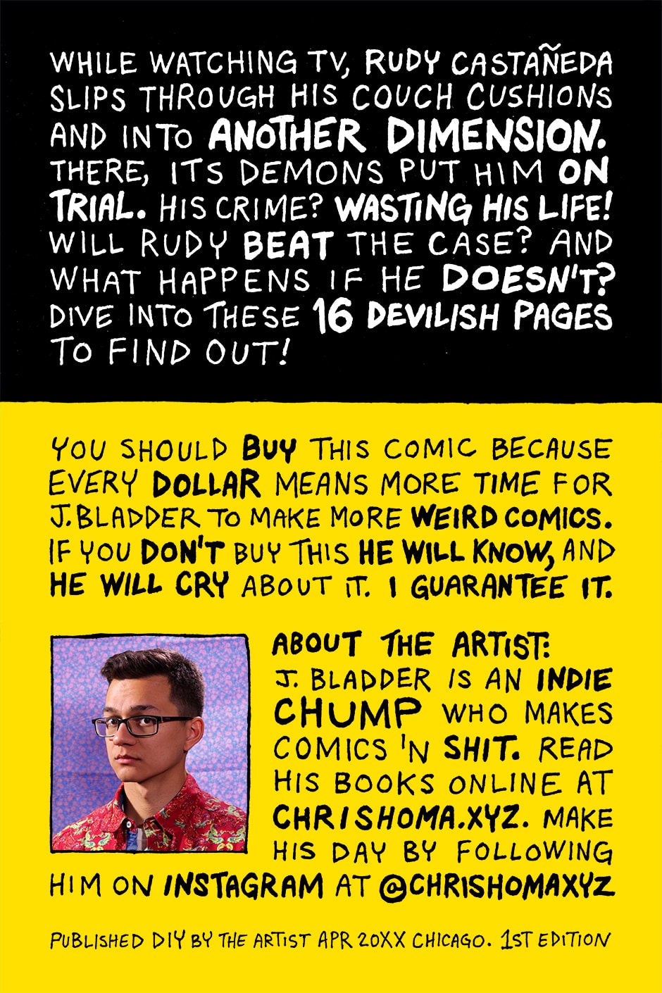 While watching TV, Rudy Castañeda slips through his couch cushions and into another dimension. There, its demons put him on trial. His crime? Wasting his life! Will Rudy beat the case? And what happens if he doesn't? Dive into these 16 devilish pages to find out!