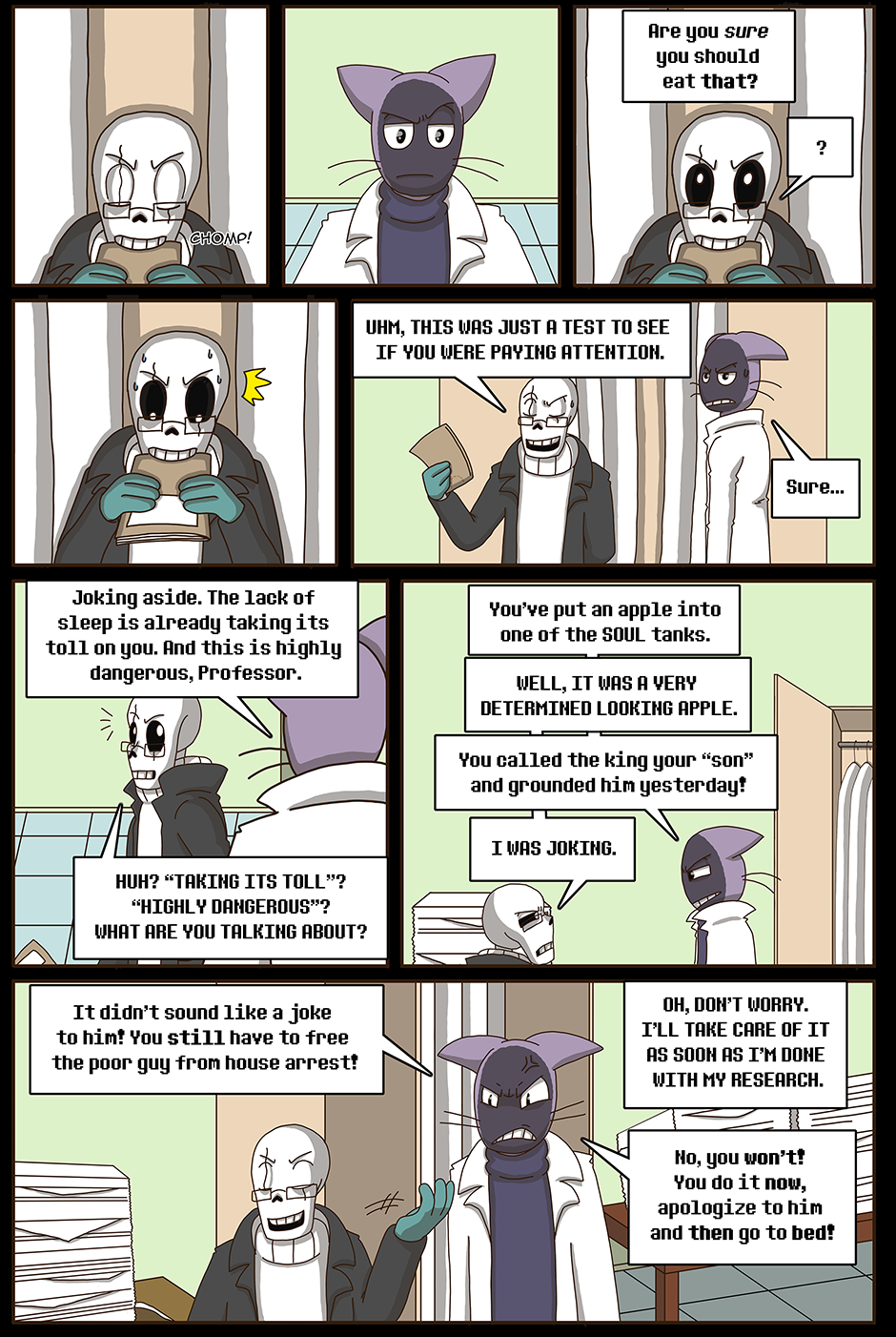 Sans finds Gaster's old journal in the True Lab and starts to read about his science misadventures. It turns out that the royal scientist was a caffeine-addicted manchild who stumbled from one explosive accident to the next. In the midst of that chaos, a mutagen was developed that can turn monsters into humans.