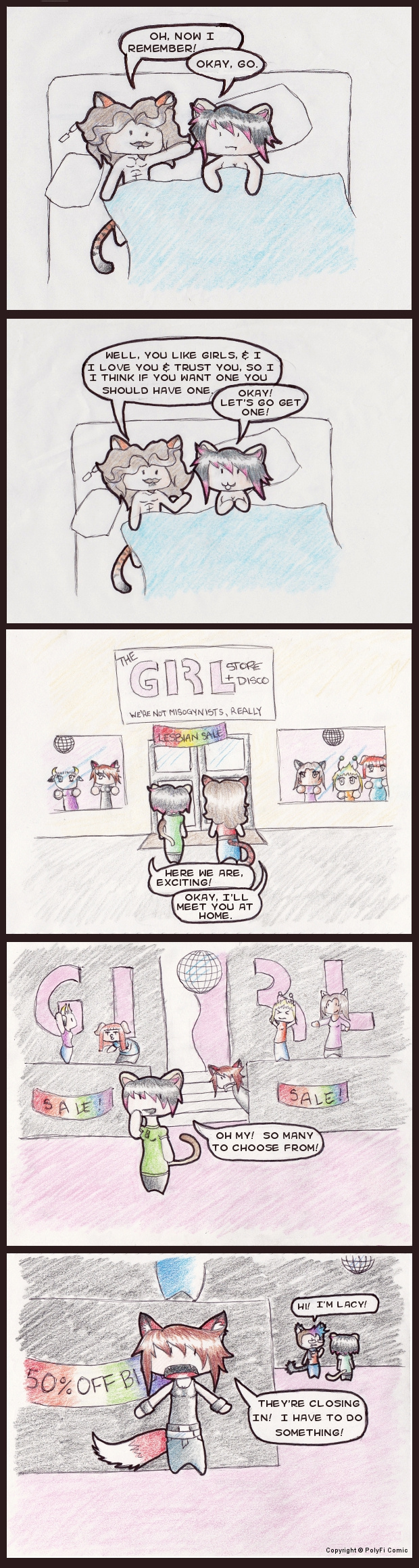 PolyFi is a comic about the almost-true adventures of a polyamorous triad. It shows that love comes in many forms. PolyFi also doesn't take itself too seriously; you don't have to be poly or LGBTQIA to enjoy it (but it helps!)