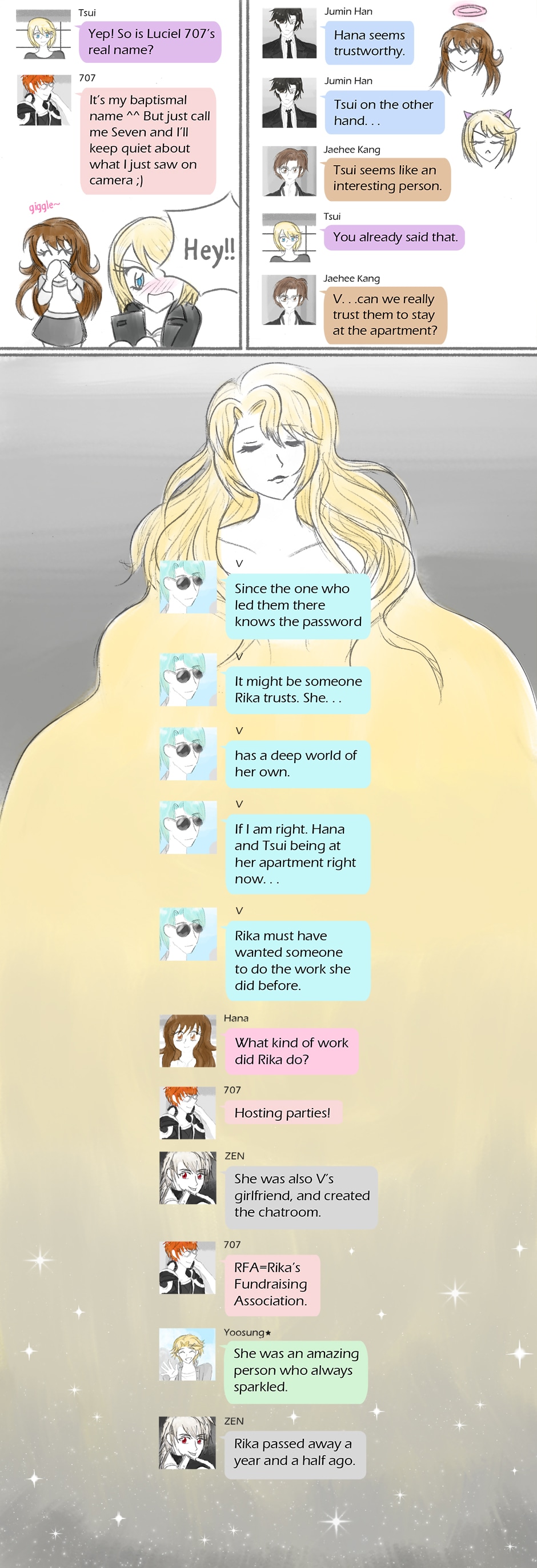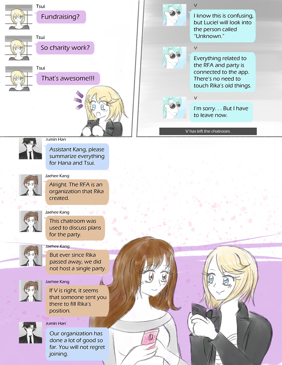 A Mystic Messenger fan comic. Trying to help a mysterious stranger leads two friends to an apartment and chatroom belonging to a group of hot guys called the RFA! Hana and Tsui are tasked with staying at the apartment and coordinating the RFA's next party. As the girls get to know the group members, romance blossoms, but all isn't as it seems. Who sent them here, and why? Secrets unravel as things soon become dangerous.