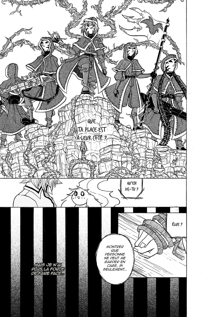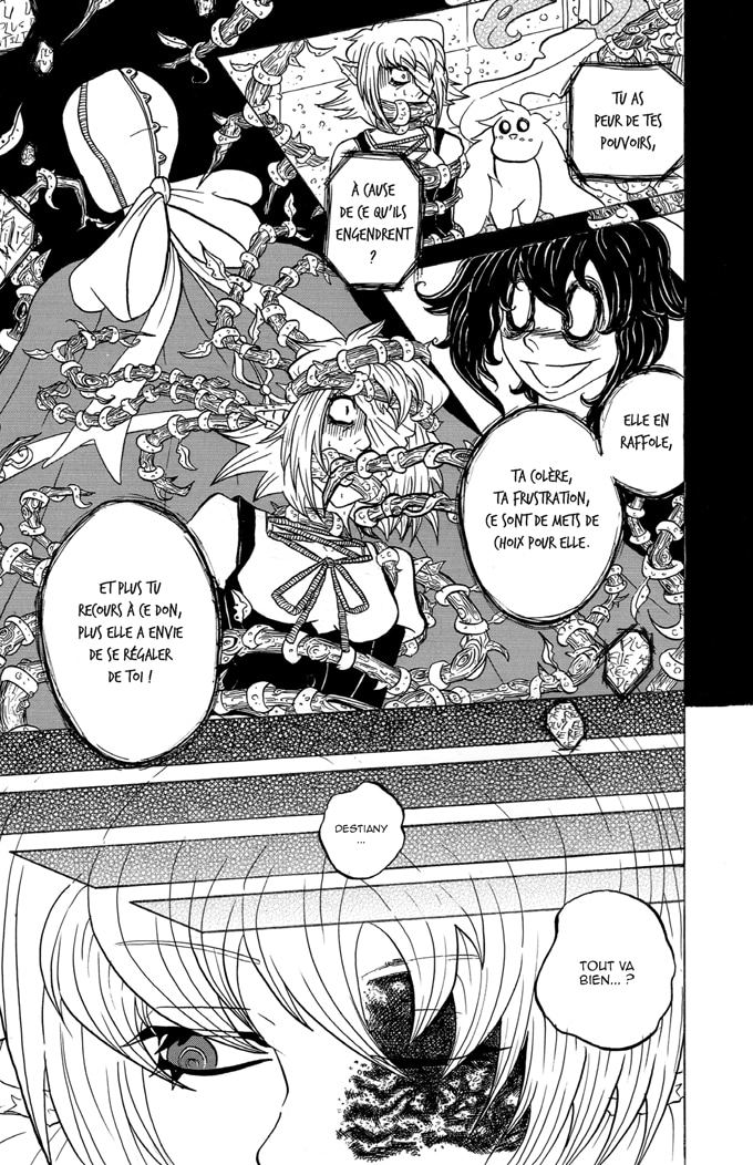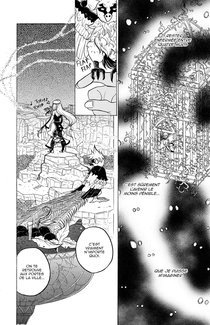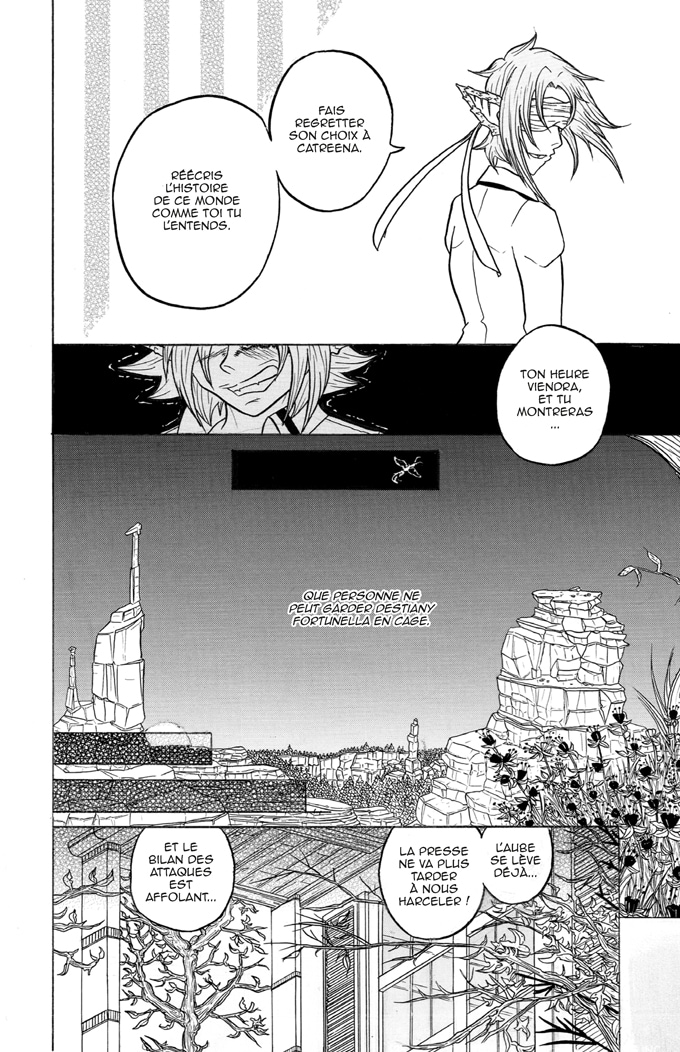 Je n'irais pas jusqu'au point de dire que c'est très manichéen, mais ça n'a pas l'air d'être le meilleur pour le personnage de Destiany. c'est la proposition de Dominique et les paroles de Salica qui m'ont fait tiquer dans ce chapitre, l'idée que "Nul ne pourra garder Destiany Fortunella en cage" va vraiment à l'encontre de l'attitude actuelle de Destiany qu'elle a depuis le chapitre 1, ou justement elle préfère rester en cage et éviter de participer dans les conflits.