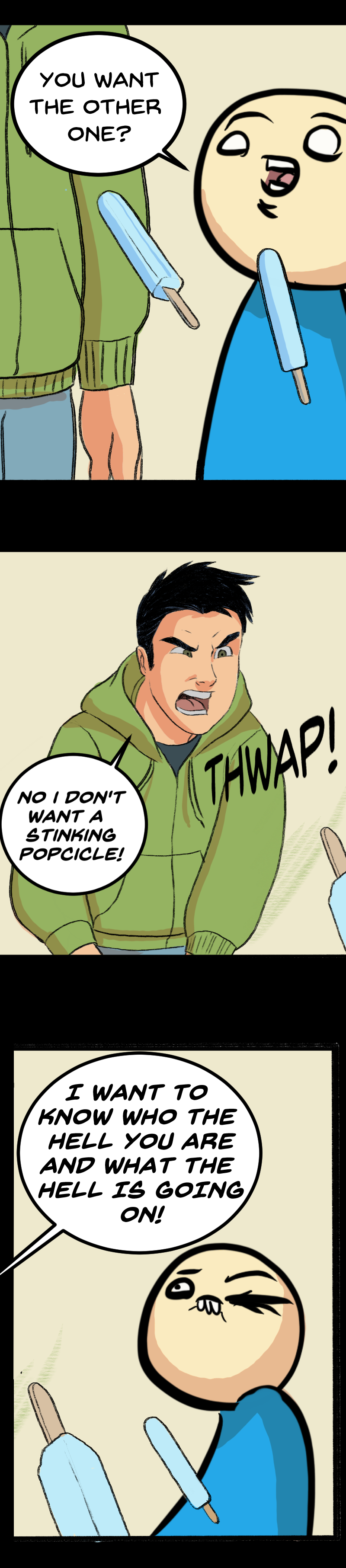 When Chuck & Tim, two webcomic characters jump through a tear their reality they find themselves stuck in a whole new world. Now to get back home they must help Eric, a hapless clerk find the meaning of meaninglessness. In the process they will discover life, love, and the best burrito in Arizona.