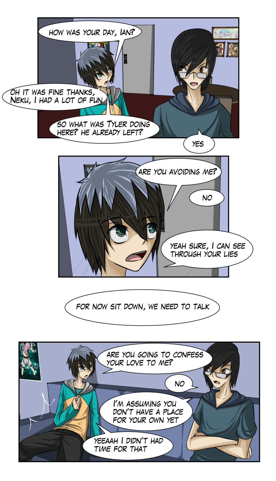 Neku is a quiet guy who doesn't like much the idea of interacting with others, on the other hand Dorian is an apparently cheerful and charismatic guy, but in reality, the first one is quite friendly and concerned, but with fear, and the other one has a troubled life covered with lies. both of them will be living together for some time to see if they can overcome their masks.