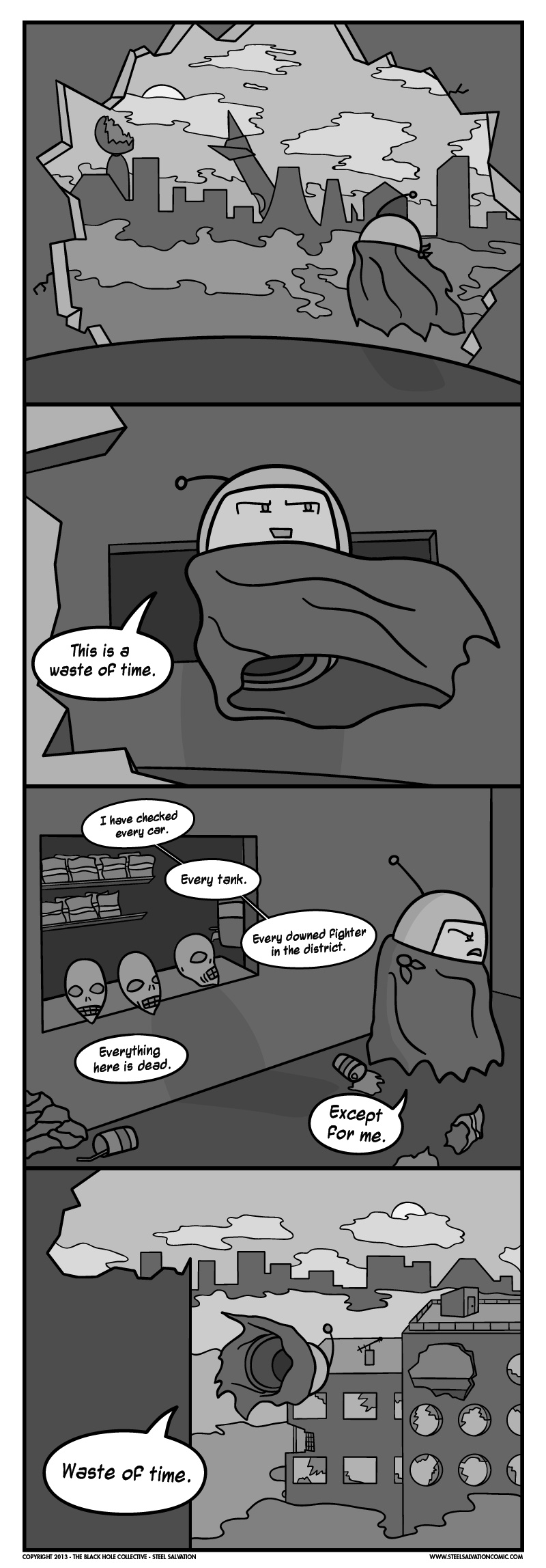 Steel Salvation is a sci-fi adventure starring Dy-Gar, slayer of humans and liberator of machines. Or so he says. Living alone on the dead planet of Cykta, there is no one left to question his self-appointed status as the savior of robotkind, although he does seem to be a bit small for a genocidal war machine. Dy-Gar longs to be free of his prison, and his increasingly desperate schemes have culminated in one last attempt to escape the blasted hellscape that used to be his homeworld. Haunted by a digital phantom and armed with a mysterious artifact from the Robot Revolution, Dy-Gar combs the wasteland, dreaming of the day when he can resume his rampage across the galaxy at large…