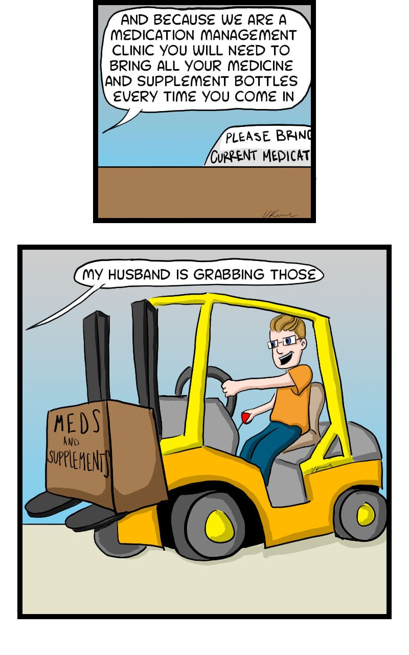 I started my official pain management strategy this past week. I take so many daily meds and supplements for other issues it was a real pain bringing in all of my bottles.