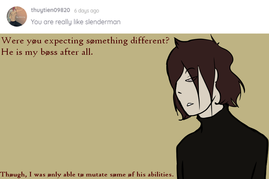 Hebe: Were you expecting something different? He is my boss after all. Though, I was only able to mutate some of his abilities. Want to ask a question? Comment below or go to my DA or Tumblr. (link on my profile)